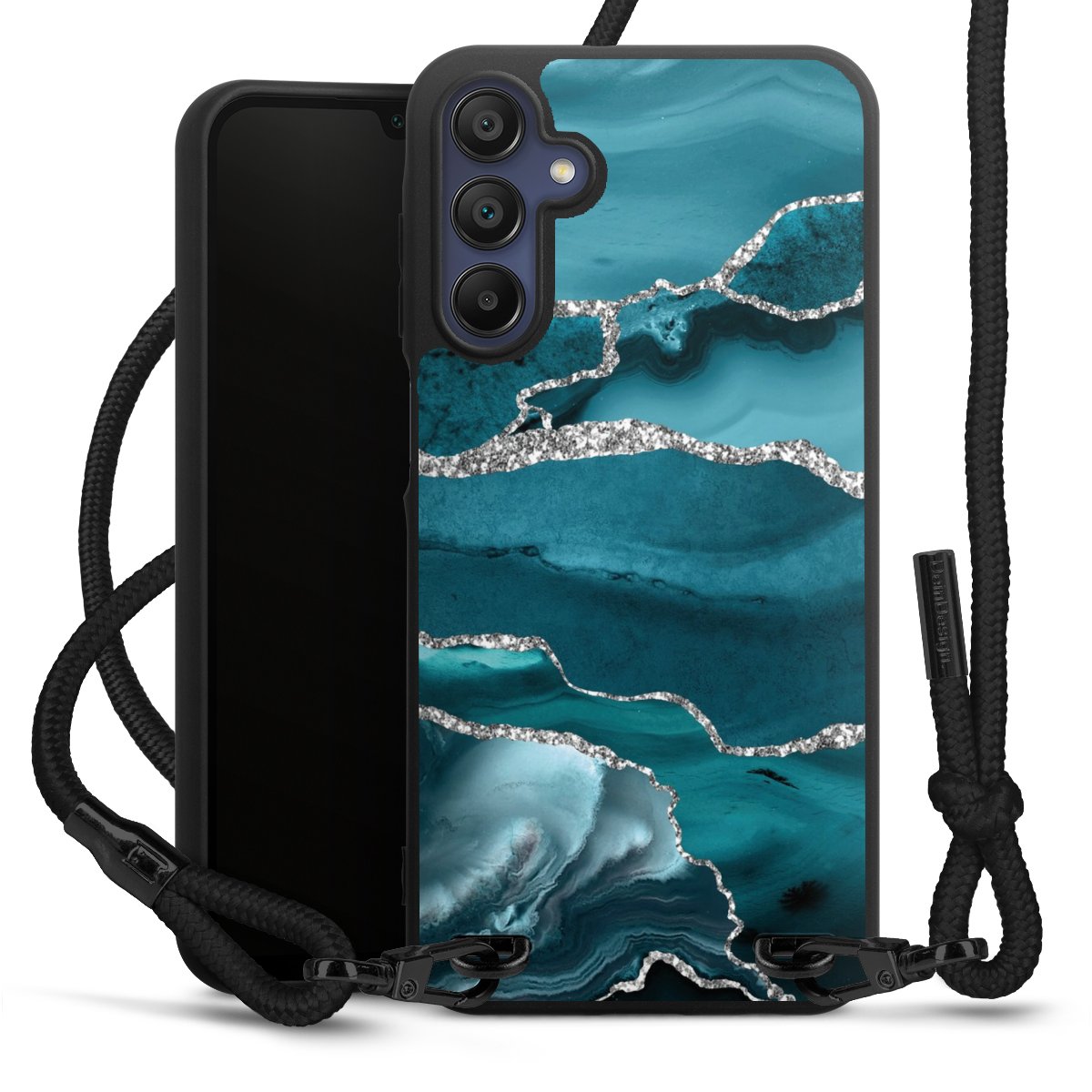 The matt black silicone case is made of flexible TPU (thermoplastic polyurethane) and offers robust protection. The durable, unbreakable material makes the cover flexible and dimensionally stable at the same time. The matte surface makes your design stand out more and is less susceptible to fingerprints and dirt. The stylish trend accessory fits comfortably in the hand and is perfectly complemented by the fabric (polyester) mobile phone strap. The braided fabric strap is approx. 1.70 metres long with a diameter of approx. 0.5 cm. Due to the special knotting technique, the length of the strap can be adjusted by simply pulling it, so that you can adapt it individually to your wishes. The practical case to wear around your neck is available with the fabric strap in black. As a little icing on the cake, we have provided the strap with a chic metal fastener in matt black. The strap is securely fastened to the case with loops made of high-quality genuine leather and press studs. The ends of the fabric strap are covered with metallic end caps and thus protected from fraying.