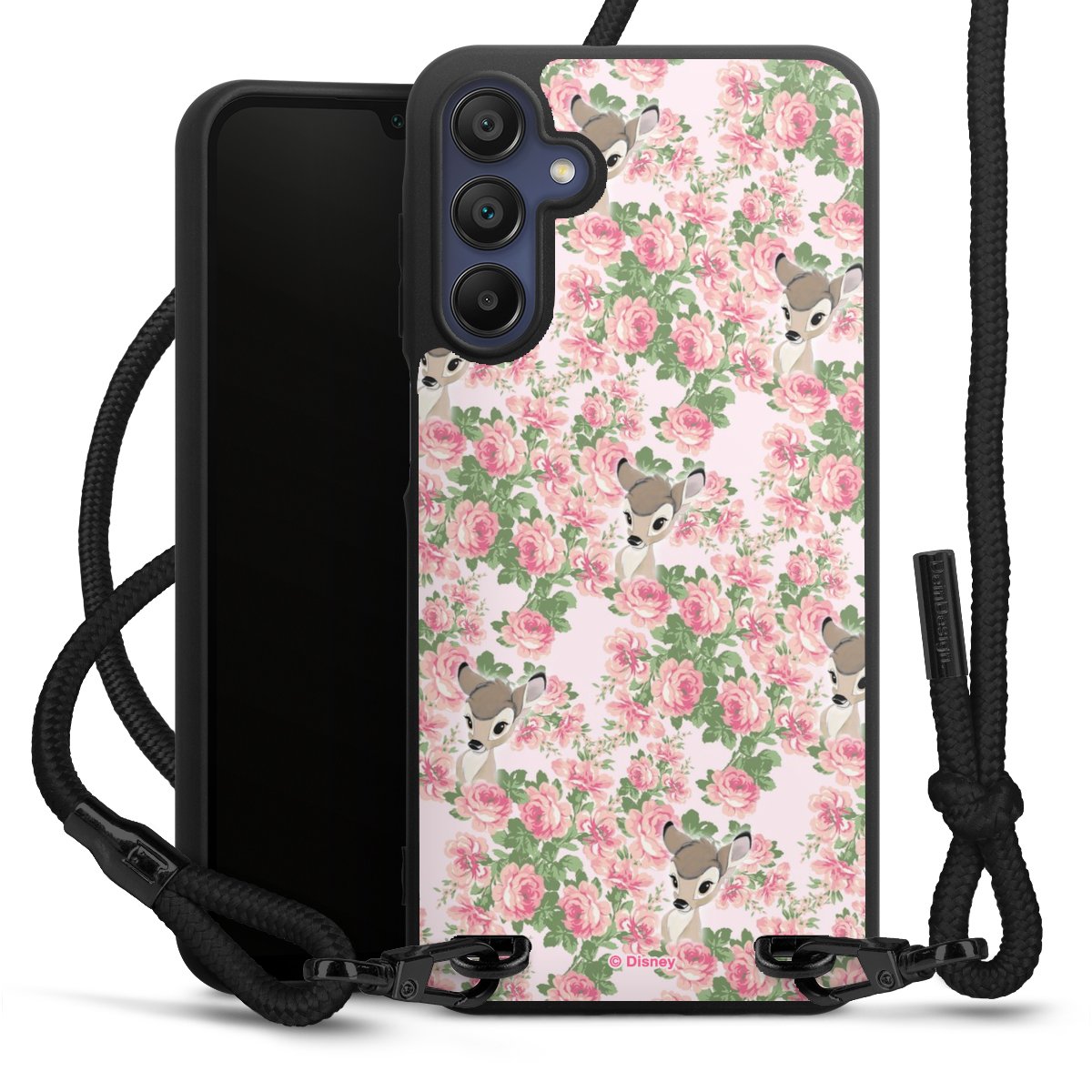 The matt black silicone case is made of flexible TPU (thermoplastic polyurethane) and offers robust protection. The durable, unbreakable material makes the cover flexible and dimensionally stable at the same time. The matte surface makes your design stand out more and is less susceptible to fingerprints and dirt. The stylish trend accessory fits comfortably in the hand and is perfectly complemented by the fabric (polyester) mobile phone strap. The braided fabric strap is approx. 1.70 metres long with a diameter of approx. 0.5 cm. Due to the special knotting technique, the length of the strap can be adjusted by simply pulling it, so that you can adapt it individually to your wishes. The practical case to wear around your neck is available with the fabric strap in black. As a little icing on the cake, we have provided the strap with a chic metal fastener in matt black. The strap is securely fastened to the case with loops made of high-quality genuine leather and press studs. The ends of the fabric strap are covered with metallic end caps and thus protected from fraying.