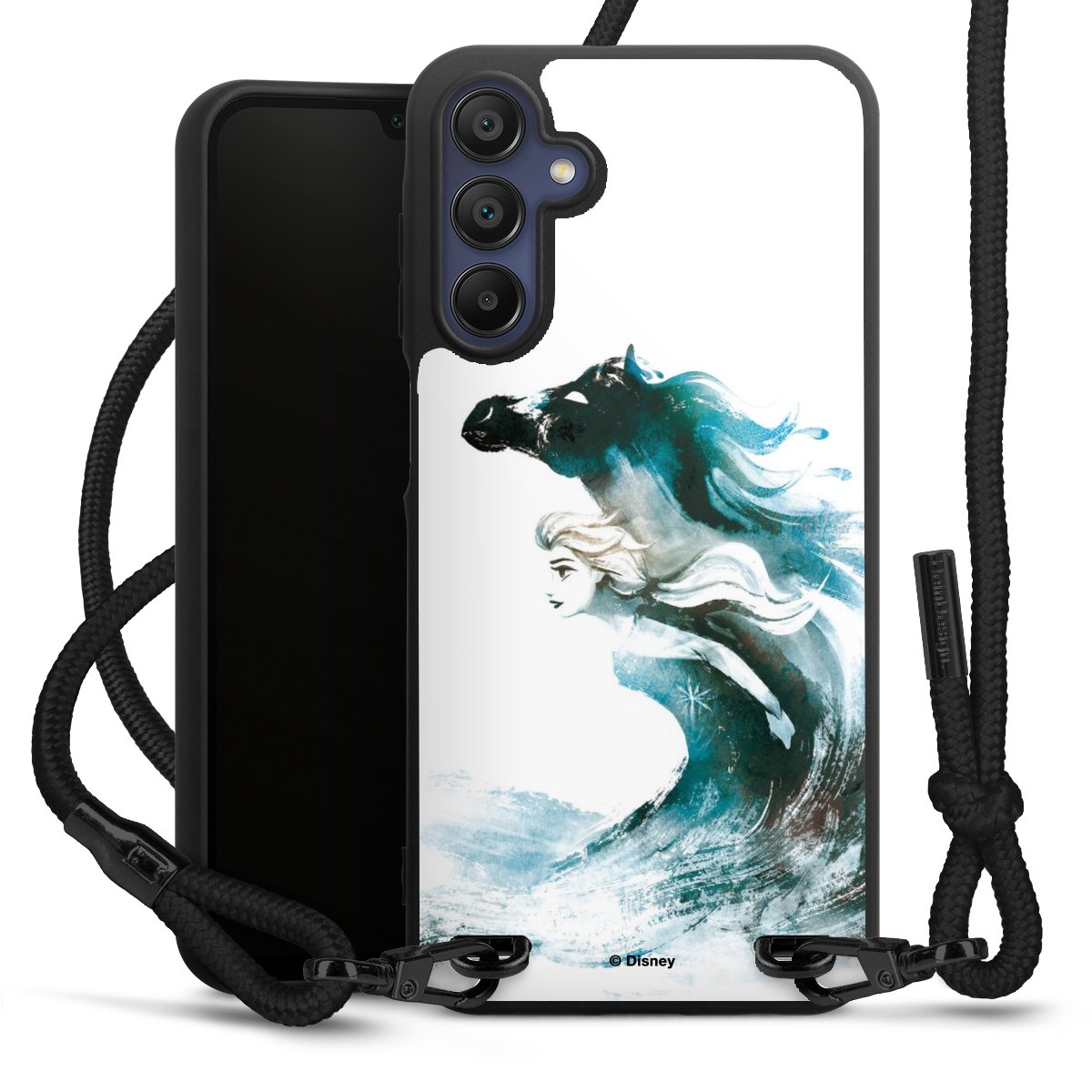 The matt black silicone case is made of flexible TPU (thermoplastic polyurethane) and offers robust protection. The durable, unbreakable material makes the cover flexible and dimensionally stable at the same time. The matte surface makes your design stand out more and is less susceptible to fingerprints and dirt. The stylish trend accessory fits comfortably in the hand and is perfectly complemented by the fabric (polyester) mobile phone strap. The braided fabric strap is approx. 1.70 metres long with a diameter of approx. 0.5 cm. Due to the special knotting technique, the length of the strap can be adjusted by simply pulling it, so that you can adapt it individually to your wishes. The practical case to wear around your neck is available with the fabric strap in black. As a little icing on the cake, we have provided the strap with a chic metal fastener in matt black. The strap is securely fastened to the case with loops made of high-quality genuine leather and press studs. The ends of the fabric strap are covered with metallic end caps and thus protected from fraying.