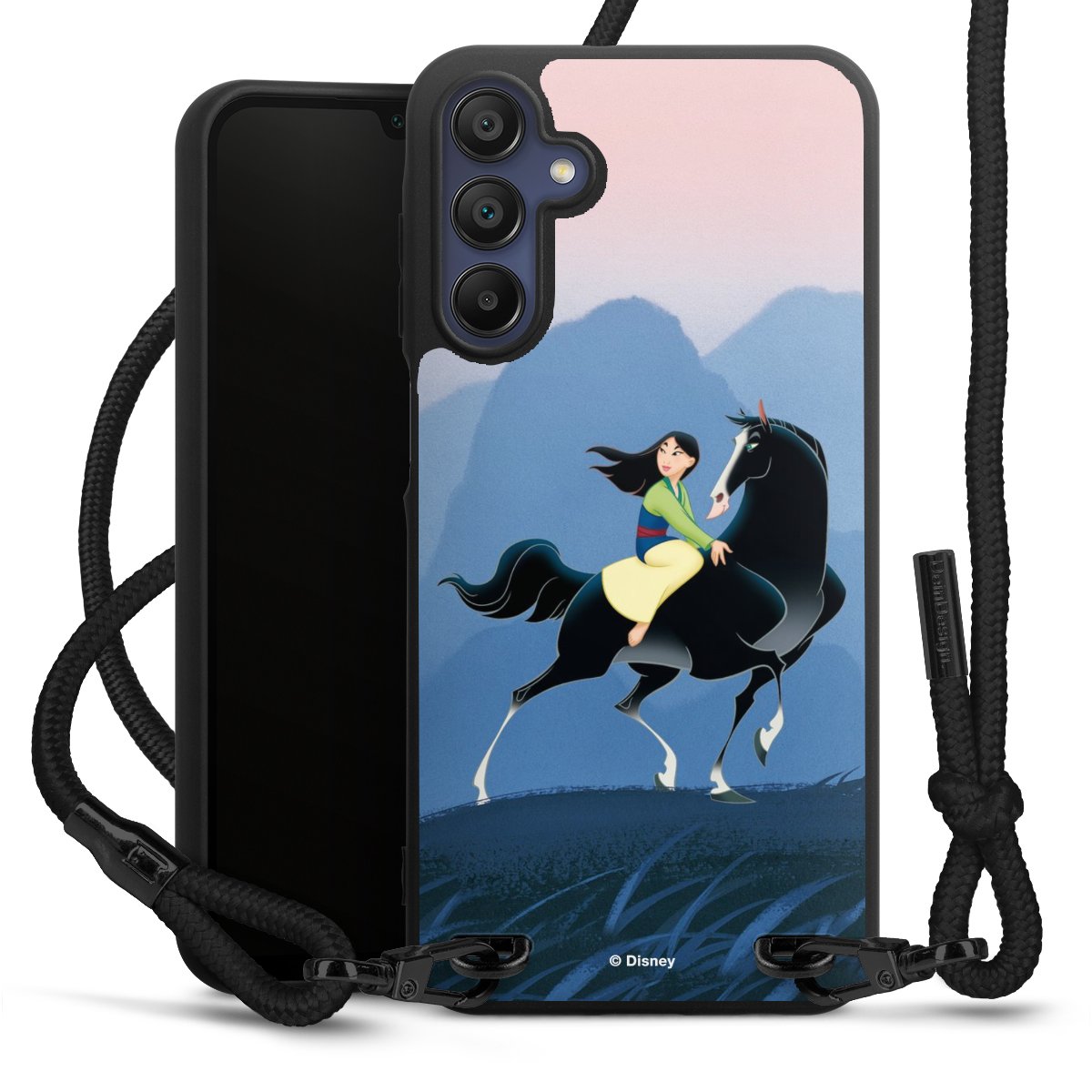 The matt black silicone case is made of flexible TPU (thermoplastic polyurethane) and offers robust protection. The durable, unbreakable material makes the cover flexible and dimensionally stable at the same time. The matte surface makes your design stand out more and is less susceptible to fingerprints and dirt. The stylish trend accessory fits comfortably in the hand and is perfectly complemented by the fabric (polyester) mobile phone strap. The braided fabric strap is approx. 1.70 metres long with a diameter of approx. 0.5 cm. Due to the special knotting technique, the length of the strap can be adjusted by simply pulling it, so that you can adapt it individually to your wishes. The practical case to wear around your neck is available with the fabric strap in black. As a little icing on the cake, we have provided the strap with a chic metal fastener in matt black. The strap is securely fastened to the case with loops made of high-quality genuine leather and press studs. The ends of the fabric strap are covered with metallic end caps and thus protected from fraying.