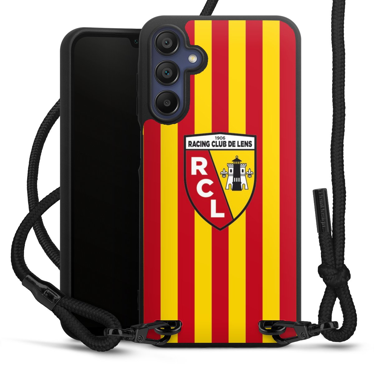 The matt black silicone case is made of flexible TPU (thermoplastic polyurethane) and offers robust protection. The durable, unbreakable material makes the cover flexible and dimensionally stable at the same time. The matte surface makes your design stand out more and is less susceptible to fingerprints and dirt. The stylish trend accessory fits comfortably in the hand and is perfectly complemented by the fabric (polyester) mobile phone strap. The braided fabric strap is approx. 1.70 metres long with a diameter of approx. 0.5 cm. Due to the special knotting technique, the length of the strap can be adjusted by simply pulling it, so that you can adapt it individually to your wishes. The practical case to wear around your neck is available with the fabric strap in black. As a little icing on the cake, we have provided the strap with a chic metal fastener in matt black. The strap is securely fastened to the case with loops made of high-quality genuine leather and press studs. The ends of the fabric strap are covered with metallic end caps and thus protected from fraying.