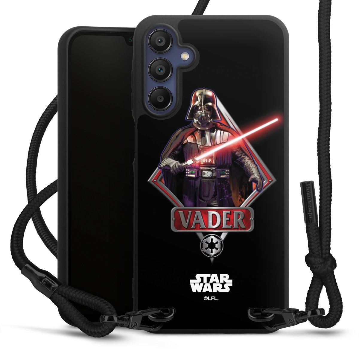 Pure Black: Phone case, fabric strap and metal details in stylish matt black.