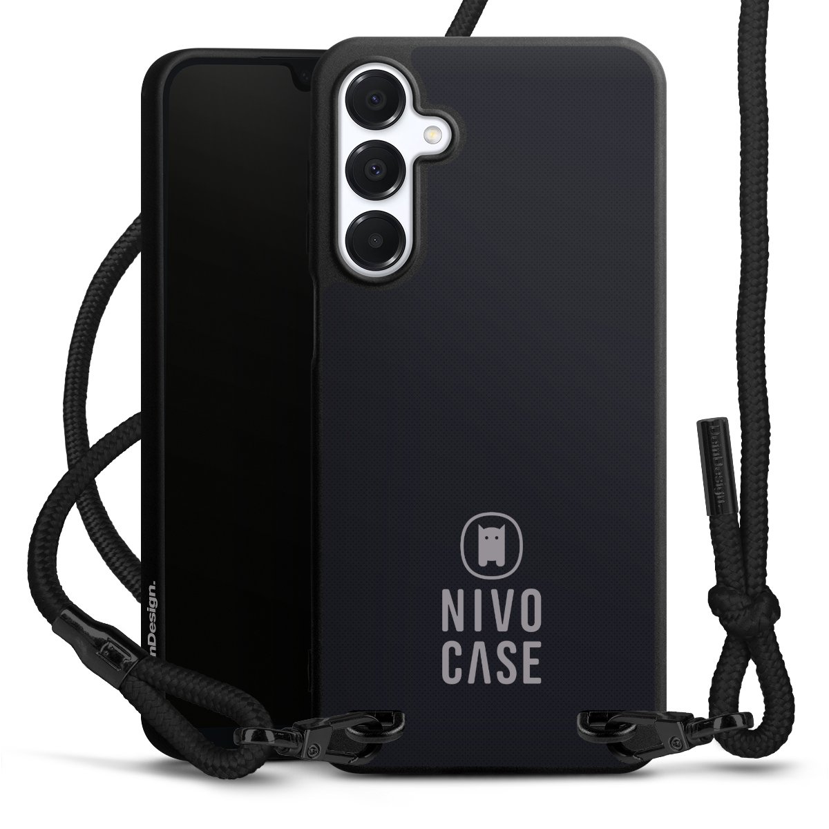 The matt black silicone case is made of flexible TPU (thermoplastic polyurethane) and offers robust protection. The durable, unbreakable material makes the cover flexible and dimensionally stable at the same time. The matte surface makes your design stand out more and is less susceptible to fingerprints and dirt. The stylish trend accessory fits comfortably in the hand and is perfectly complemented by the fabric (polyester) mobile phone strap. The braided fabric strap is approx. 1.70 metres long with a diameter of approx. 0.5 cm. Due to the special knotting technique, the length of the strap can be adjusted by simply pulling it, so that you can adapt it individually to your wishes. The practical case to wear around your neck is available with the fabric strap in black. As a little icing on the cake, we have provided the strap with a chic metal fastener in matt black. The strap is securely fastened to the case with loops made of high-quality genuine leather and press studs. The ends of the fabric strap are covered with metallic end caps and thus protected from fraying.