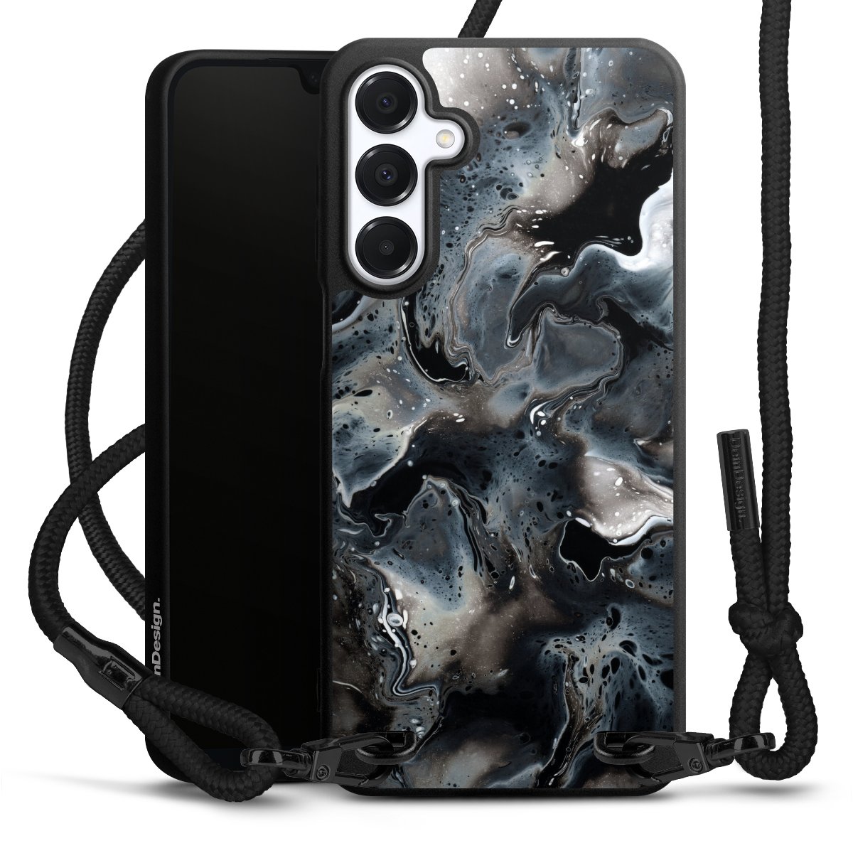 Pure Black: Phone case, fabric strap and metal details in stylish matt black.