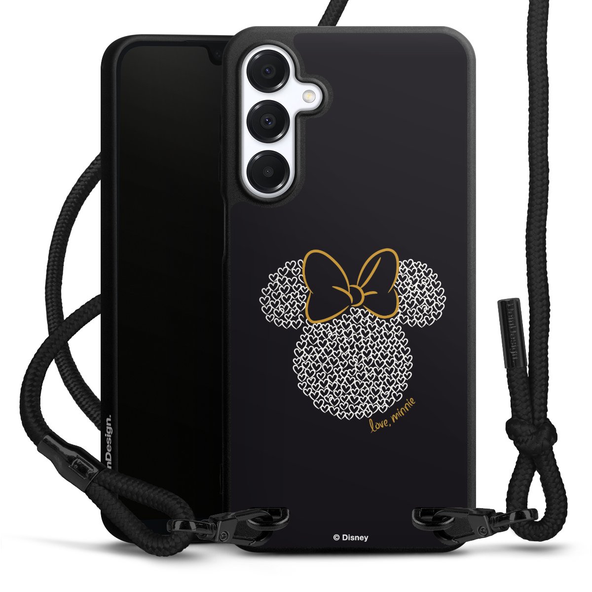 The matt black silicone case is made of flexible TPU (thermoplastic polyurethane) and offers robust protection. The durable, unbreakable material makes the cover flexible and dimensionally stable at the same time. The matte surface makes your design stand out more and is less susceptible to fingerprints and dirt. The stylish trend accessory fits comfortably in the hand and is perfectly complemented by the fabric (polyester) mobile phone strap. The braided fabric strap is approx. 1.70 metres long with a diameter of approx. 0.5 cm. Due to the special knotting technique, the length of the strap can be adjusted by simply pulling it, so that you can adapt it individually to your wishes. The practical case to wear around your neck is available with the fabric strap in black. As a little icing on the cake, we have provided the strap with a chic metal fastener in matt black. The strap is securely fastened to the case with loops made of high-quality genuine leather and press studs. The ends of the fabric strap are covered with metallic end caps and thus protected from fraying.