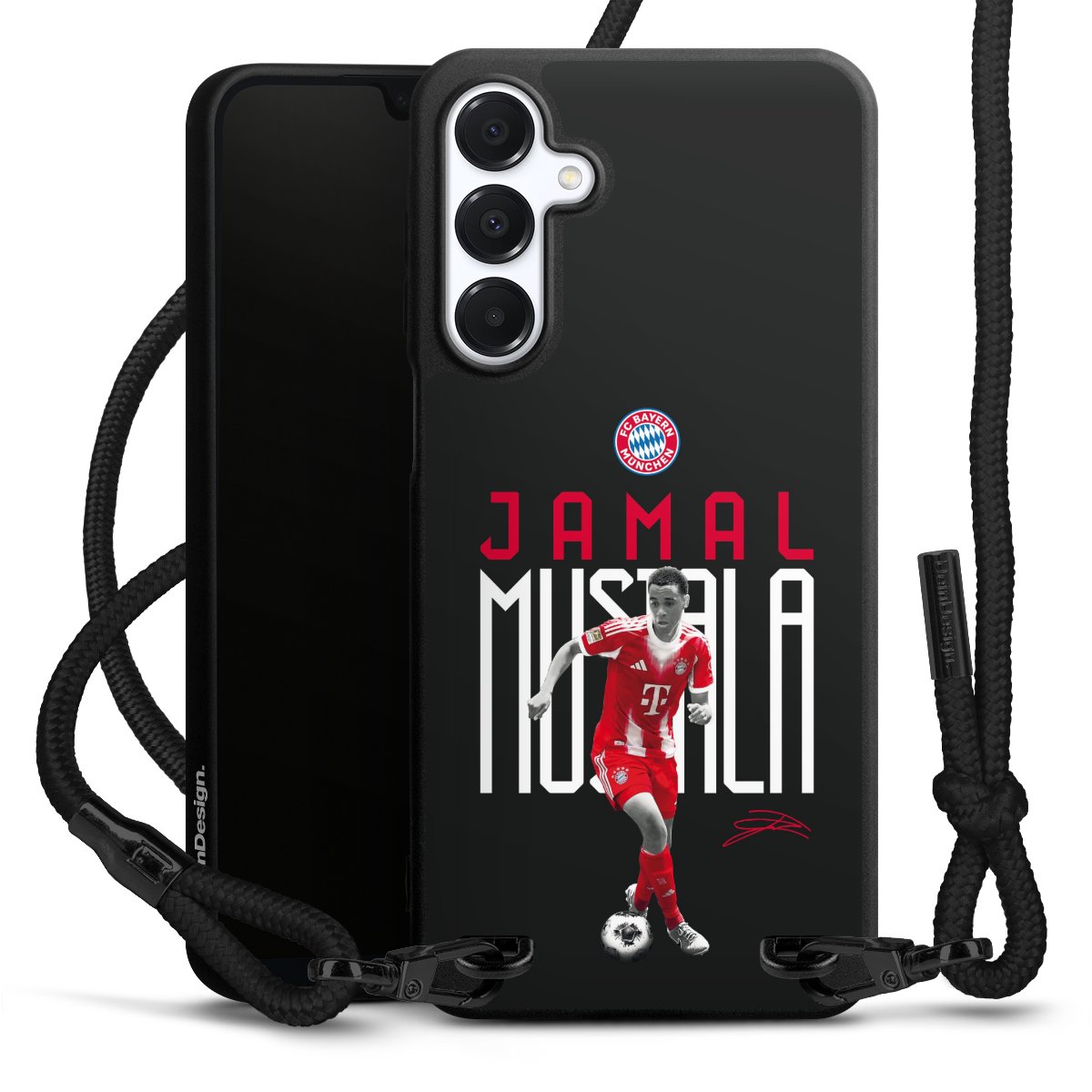 The matt black silicone case is made of flexible TPU (thermoplastic polyurethane) and offers robust protection. The durable, unbreakable material makes the cover flexible and dimensionally stable at the same time. The matte surface makes your design stand out more and is less susceptible to fingerprints and dirt. The stylish trend accessory fits comfortably in the hand and is perfectly complemented by the fabric (polyester) mobile phone strap. The braided fabric strap is approx. 1.70 metres long with a diameter of approx. 0.5 cm. Due to the special knotting technique, the length of the strap can be adjusted by simply pulling it, so that you can adapt it individually to your wishes. The practical case to wear around your neck is available with the fabric strap in black. As a little icing on the cake, we have provided the strap with a chic metal fastener in matt black. The strap is securely fastened to the case with loops made of high-quality genuine leather and press studs. The ends of the fabric strap are covered with metallic end caps and thus protected from fraying.