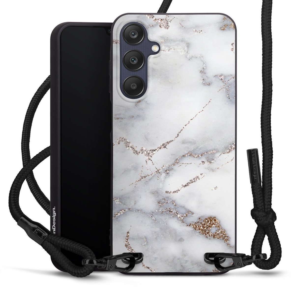 The matt black silicone case is made of flexible TPU (thermoplastic polyurethane) and offers robust protection. The durable, unbreakable material makes the cover flexible and dimensionally stable at the same time. The matte surface makes your design stand out more and is less susceptible to fingerprints and dirt. The stylish trend accessory fits comfortably in the hand and is perfectly complemented by the fabric (polyester) mobile phone strap. The braided fabric strap is approx. 1.70 metres long with a diameter of approx. 0.5 cm. Due to the special knotting technique, the length of the strap can be adjusted by simply pulling it, so that you can adapt it individually to your wishes. The practical case to wear around your neck is available with the fabric strap in black. As a little icing on the cake, we have provided the strap with a chic metal fastener in matt black. The strap is securely fastened to the case with loops made of high-quality genuine leather and press studs. The ends of the fabric strap are covered with metallic end caps and thus protected from fraying.