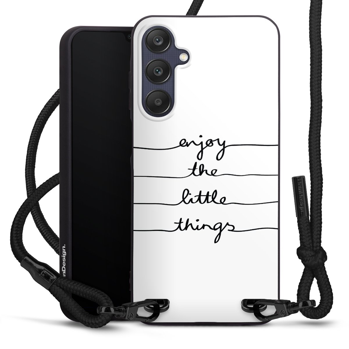 The matt black silicone case is made of flexible TPU (thermoplastic polyurethane) and offers robust protection. The durable, unbreakable material makes the cover flexible and dimensionally stable at the same time. The matte surface makes your design stand out more and is less susceptible to fingerprints and dirt. The stylish trend accessory fits comfortably in the hand and is perfectly complemented by the fabric (polyester) mobile phone strap. The braided fabric strap is approx. 1.70 metres long with a diameter of approx. 0.5 cm. Due to the special knotting technique, the length of the strap can be adjusted by simply pulling it, so that you can adapt it individually to your wishes. The practical case to wear around your neck is available with the fabric strap in black. As a little icing on the cake, we have provided the strap with a chic metal fastener in matt black. The strap is securely fastened to the case with loops made of high-quality genuine leather and press studs. The ends of the fabric strap are covered with metallic end caps and thus protected from fraying.