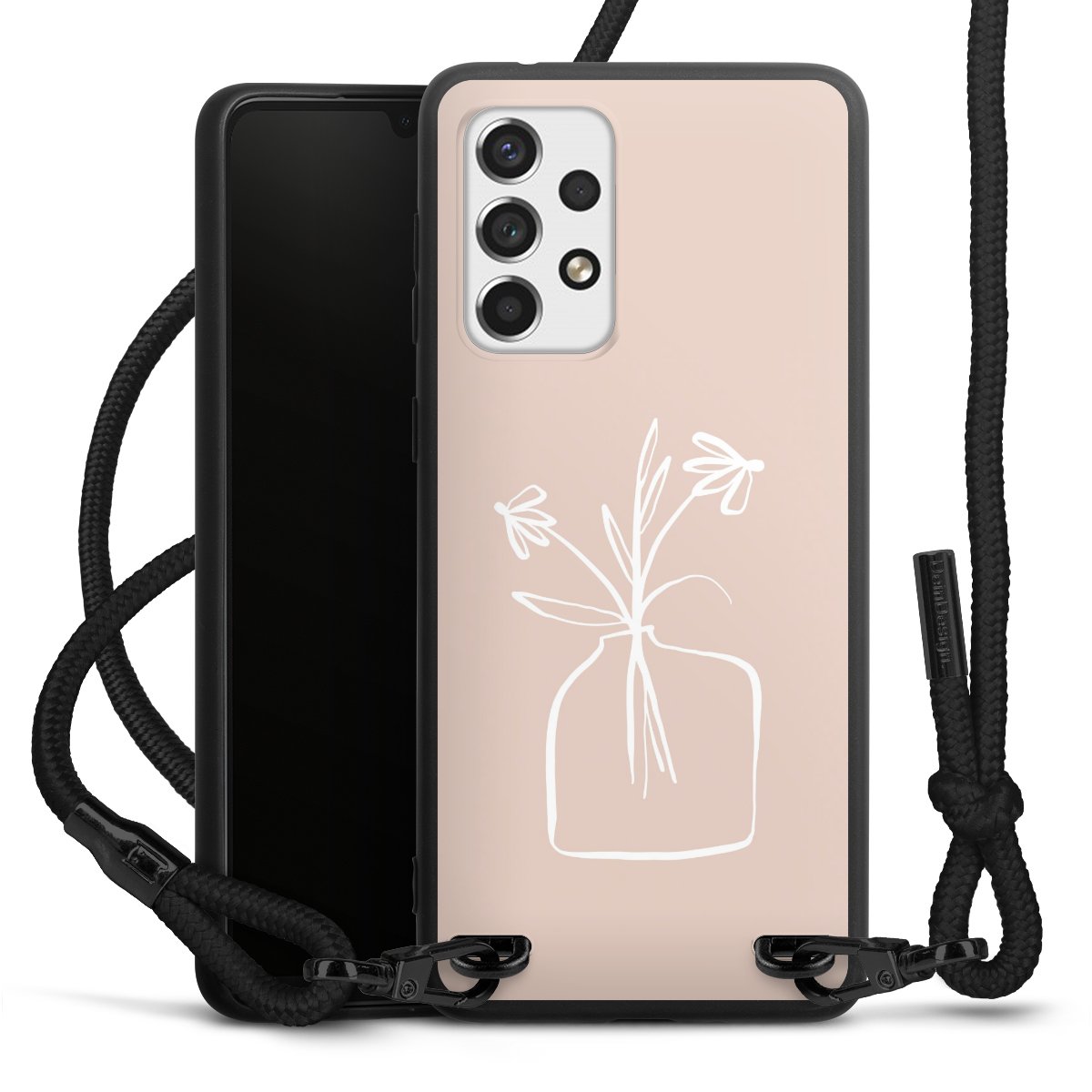The matt black silicone case is made of flexible TPU (thermoplastic polyurethane) and offers robust protection. The durable, unbreakable material makes the cover flexible and dimensionally stable at the same time. The matte surface makes your design stand out more and is less susceptible to fingerprints and dirt. The stylish trend accessory fits comfortably in the hand and is perfectly complemented by the fabric (polyester) mobile phone strap. The braided fabric strap is approx. 1.70 metres long with a diameter of approx. 0.5 cm. Due to the special knotting technique, the length of the strap can be adjusted by simply pulling it, so that you can adapt it individually to your wishes. The practical case to wear around your neck is available with the fabric strap in black. As a little icing on the cake, we have provided the strap with a chic metal fastener in matt black. The strap is securely fastened to the case with loops made of high-quality genuine leather and press studs. The ends of the fabric strap are covered with metallic end caps and thus protected from fraying.