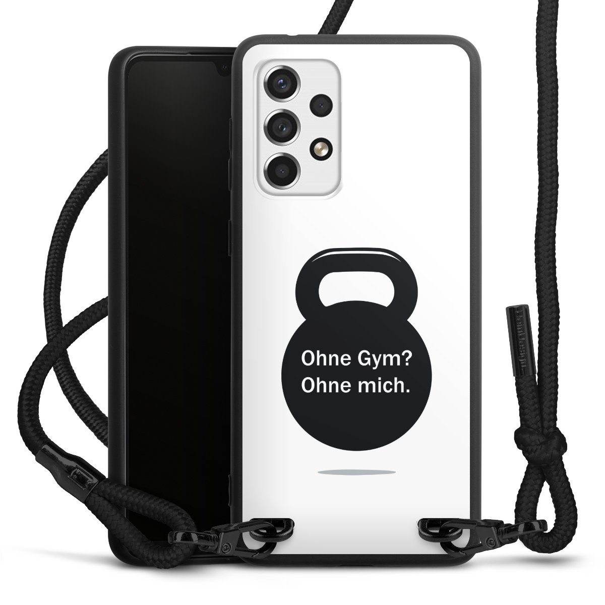 The matt black silicone case is made of flexible TPU (thermoplastic polyurethane) and offers robust protection. The durable, unbreakable material makes the cover flexible and dimensionally stable at the same time. The matte surface makes your design stand out more and is less susceptible to fingerprints and dirt. The stylish trend accessory fits comfortably in the hand and is perfectly complemented by the fabric (polyester) mobile phone strap. The braided fabric strap is approx. 1.70 metres long with a diameter of approx. 0.5 cm. Due to the special knotting technique, the length of the strap can be adjusted by simply pulling it, so that you can adapt it individually to your wishes. The practical case to wear around your neck is available with the fabric strap in black. As a little icing on the cake, we have provided the strap with a chic metal fastener in matt black. The strap is securely fastened to the case with loops made of high-quality genuine leather and press studs. The ends of the fabric strap are covered with metallic end caps and thus protected from fraying.