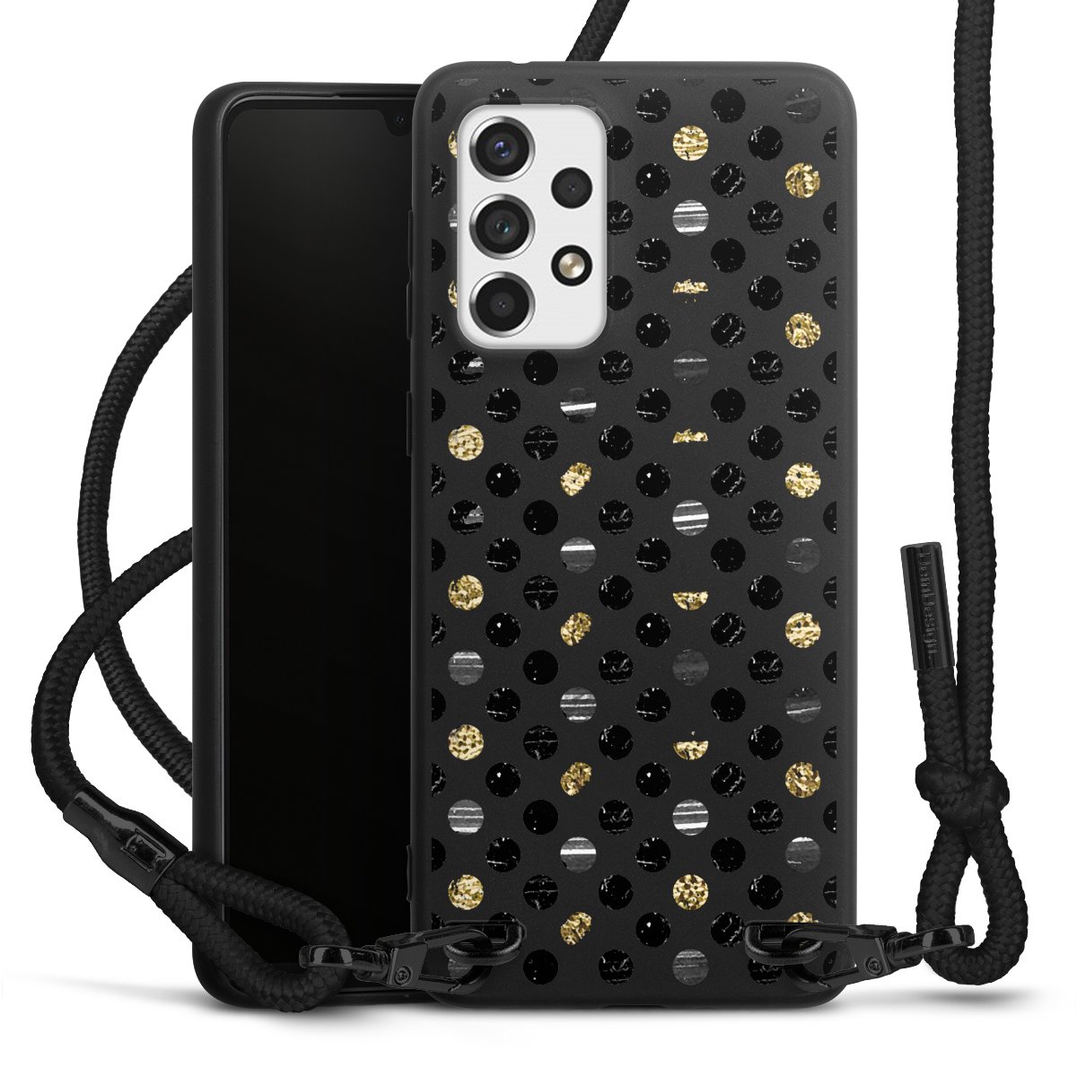 The matt black silicone case is made of flexible TPU (thermoplastic polyurethane) and offers robust protection. The durable, unbreakable material makes the cover flexible and dimensionally stable at the same time. The matte surface makes your design stand out more and is less susceptible to fingerprints and dirt. The stylish trend accessory fits comfortably in the hand and is perfectly complemented by the fabric (polyester) mobile phone strap. The braided fabric strap is approx. 1.70 metres long with a diameter of approx. 0.5 cm. Due to the special knotting technique, the length of the strap can be adjusted by simply pulling it, so that you can adapt it individually to your wishes. The practical case to wear around your neck is available with the fabric strap in black. As a little icing on the cake, we have provided the strap with a chic metal fastener in matt black. The strap is securely fastened to the case with loops made of high-quality genuine leather and press studs. The ends of the fabric strap are covered with metallic end caps and thus protected from fraying.