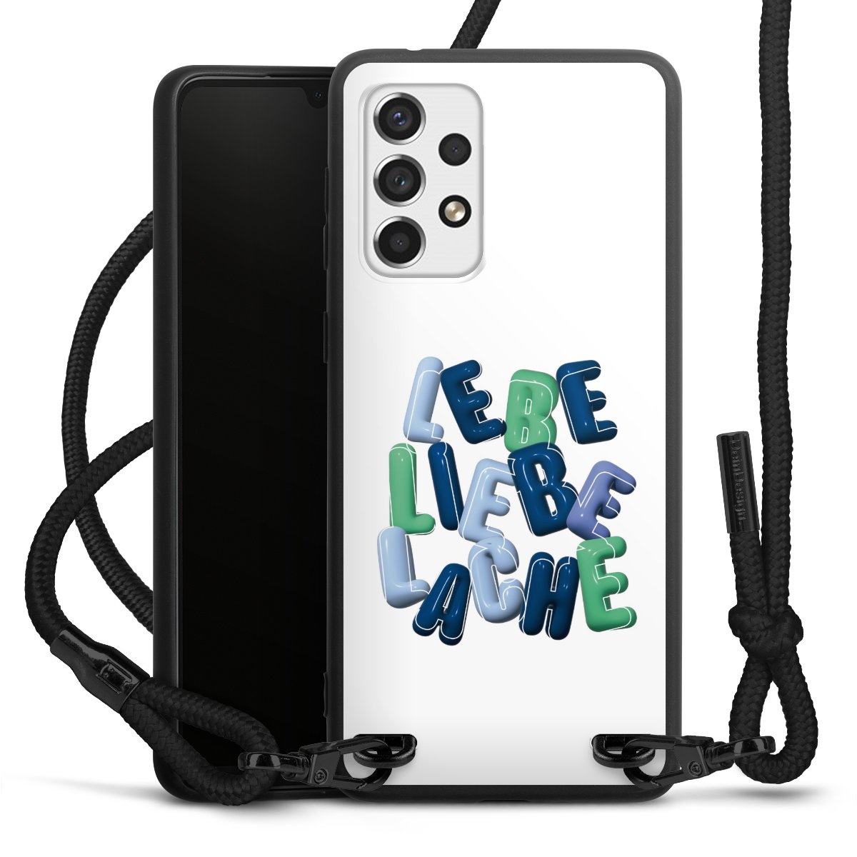 The matt black silicone case is made of flexible TPU (thermoplastic polyurethane) and offers robust protection. The durable, unbreakable material makes the cover flexible and dimensionally stable at the same time. The matte surface makes your design stand out more and is less susceptible to fingerprints and dirt. The stylish trend accessory fits comfortably in the hand and is perfectly complemented by the fabric (polyester) mobile phone strap. The braided fabric strap is approx. 1.70 metres long with a diameter of approx. 0.5 cm. Due to the special knotting technique, the length of the strap can be adjusted by simply pulling it, so that you can adapt it individually to your wishes. The practical case to wear around your neck is available with the fabric strap in black. As a little icing on the cake, we have provided the strap with a chic metal fastener in matt black. The strap is securely fastened to the case with loops made of high-quality genuine leather and press studs. The ends of the fabric strap are covered with metallic end caps and thus protected from fraying.
