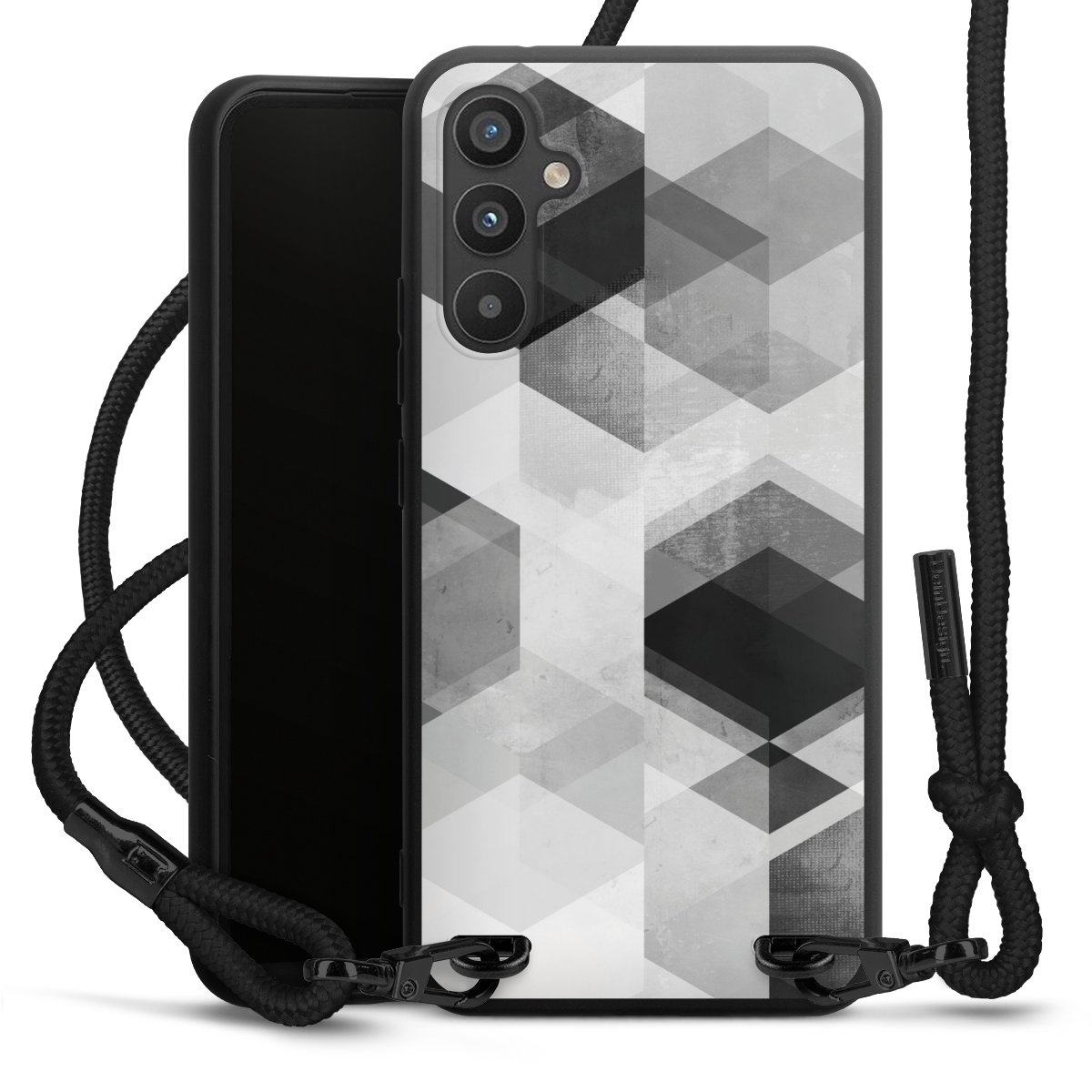 The matt black silicone case is made of flexible TPU (thermoplastic polyurethane) and offers robust protection. The durable, unbreakable material makes the cover flexible and dimensionally stable at the same time. The matte surface makes your design stand out more and is less susceptible to fingerprints and dirt. The stylish trend accessory fits comfortably in the hand and is perfectly complemented by the fabric (polyester) mobile phone strap. The braided fabric strap is approx. 1.70 metres long with a diameter of approx. 0.5 cm. Due to the special knotting technique, the length of the strap can be adjusted by simply pulling it, so that you can adapt it individually to your wishes. The practical case to wear around your neck is available with the fabric strap in black. As a little icing on the cake, we have provided the strap with a chic metal fastener in matt black. The strap is securely fastened to the case with loops made of high-quality genuine leather and press studs. The ends of the fabric strap are covered with metallic end caps and thus protected from fraying.