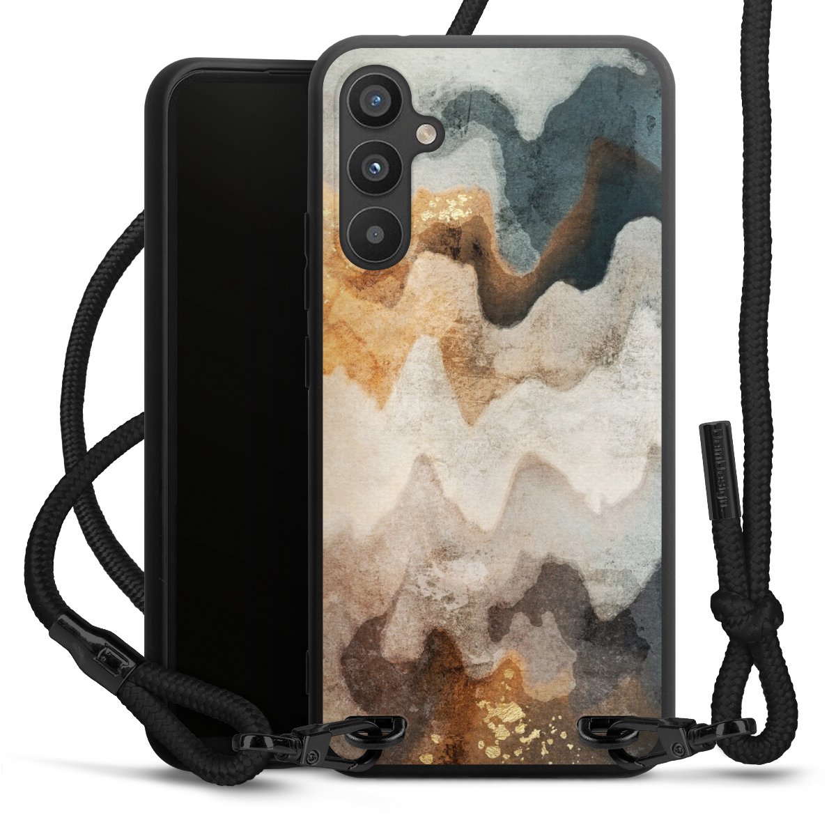 The matt black silicone case is made of flexible TPU (thermoplastic polyurethane) and offers robust protection. The durable, unbreakable material makes the cover flexible and dimensionally stable at the same time. The matte surface makes your design stand out more and is less susceptible to fingerprints and dirt. The stylish trend accessory fits comfortably in the hand and is perfectly complemented by the fabric (polyester) mobile phone strap. The braided fabric strap is approx. 1.70 metres long with a diameter of approx. 0.5 cm. Due to the special knotting technique, the length of the strap can be adjusted by simply pulling it, so that you can adapt it individually to your wishes. The practical case to wear around your neck is available with the fabric strap in black. As a little icing on the cake, we have provided the strap with a chic metal fastener in matt black. The strap is securely fastened to the case with loops made of high-quality genuine leather and press studs. The ends of the fabric strap are covered with metallic end caps and thus protected from fraying.
