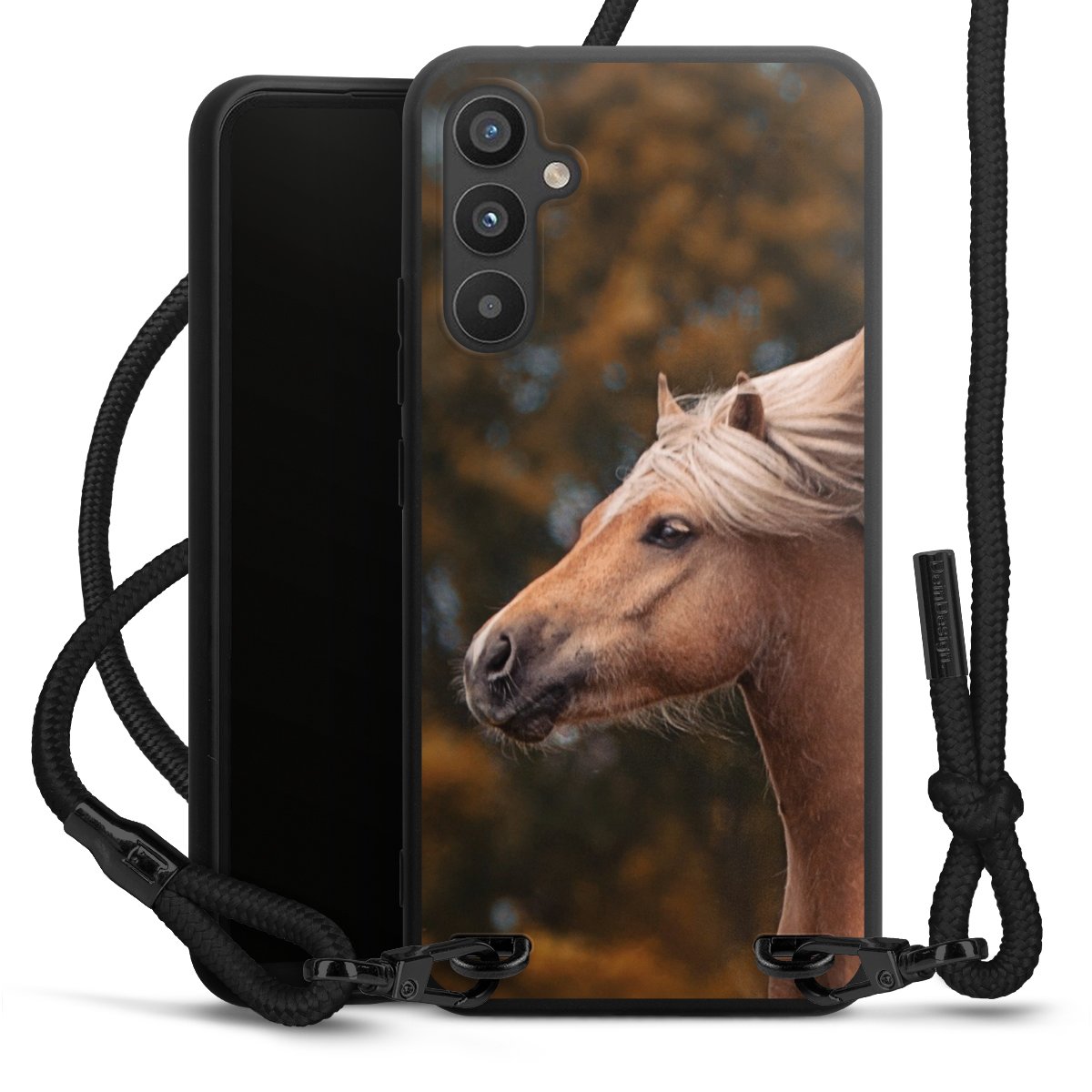 The matt black silicone case is made of flexible TPU (thermoplastic polyurethane) and offers robust protection. The durable, unbreakable material makes the cover flexible and dimensionally stable at the same time. The matte surface makes your design stand out more and is less susceptible to fingerprints and dirt. The stylish trend accessory fits comfortably in the hand and is perfectly complemented by the fabric (polyester) mobile phone strap. The braided fabric strap is approx. 1.70 metres long with a diameter of approx. 0.5 cm. Due to the special knotting technique, the length of the strap can be adjusted by simply pulling it, so that you can adapt it individually to your wishes. The practical case to wear around your neck is available with the fabric strap in black. As a little icing on the cake, we have provided the strap with a chic metal fastener in matt black. The strap is securely fastened to the case with loops made of high-quality genuine leather and press studs. The ends of the fabric strap are covered with metallic end caps and thus protected from fraying.