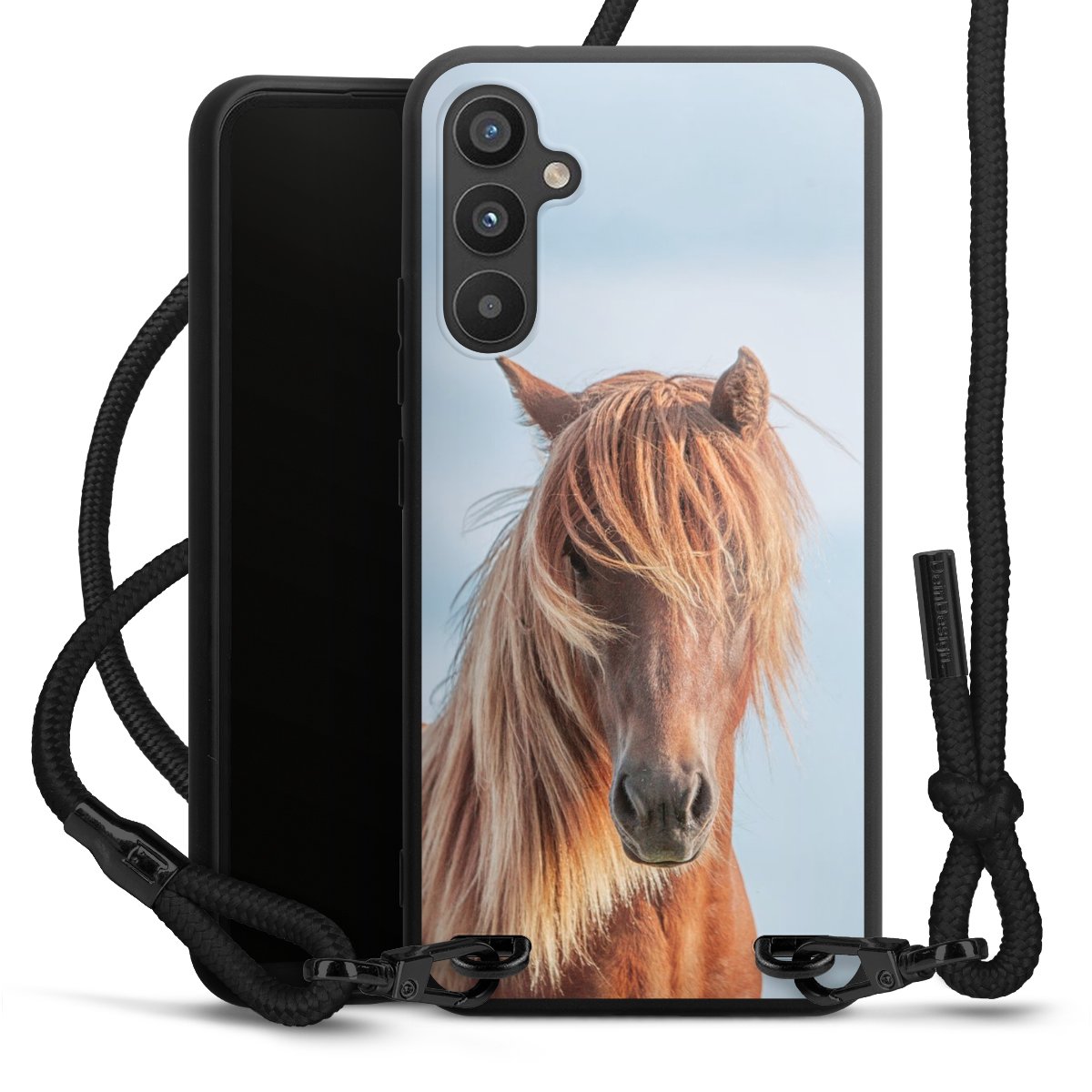 The matt black silicone case is made of flexible TPU (thermoplastic polyurethane) and offers robust protection. The durable, unbreakable material makes the cover flexible and dimensionally stable at the same time. The matte surface makes your design stand out more and is less susceptible to fingerprints and dirt. The stylish trend accessory fits comfortably in the hand and is perfectly complemented by the fabric (polyester) mobile phone strap. The braided fabric strap is approx. 1.70 metres long with a diameter of approx. 0.5 cm. Due to the special knotting technique, the length of the strap can be adjusted by simply pulling it, so that you can adapt it individually to your wishes. The practical case to wear around your neck is available with the fabric strap in black. As a little icing on the cake, we have provided the strap with a chic metal fastener in matt black. The strap is securely fastened to the case with loops made of high-quality genuine leather and press studs. The ends of the fabric strap are covered with metallic end caps and thus protected from fraying.