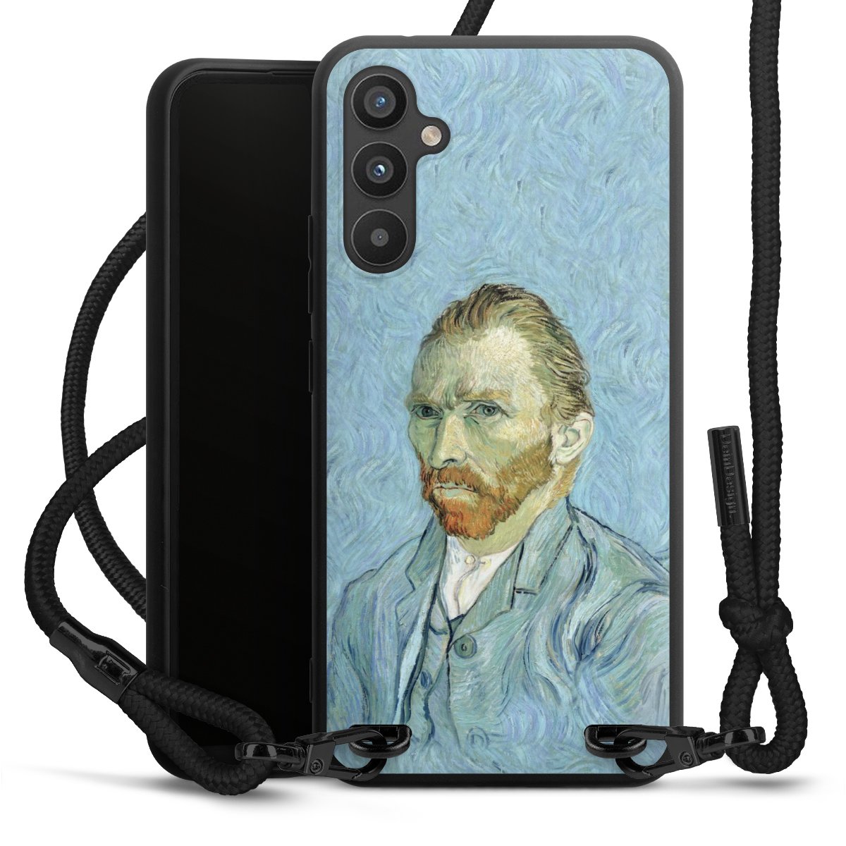 The matt black silicone case is made of flexible TPU (thermoplastic polyurethane) and offers robust protection. The durable, unbreakable material makes the cover flexible and dimensionally stable at the same time. The matte surface makes your design stand out more and is less susceptible to fingerprints and dirt. The stylish trend accessory fits comfortably in the hand and is perfectly complemented by the fabric (polyester) mobile phone strap. The braided fabric strap is approx. 1.70 metres long with a diameter of approx. 0.5 cm. Due to the special knotting technique, the length of the strap can be adjusted by simply pulling it, so that you can adapt it individually to your wishes. The practical case to wear around your neck is available with the fabric strap in black. As a little icing on the cake, we have provided the strap with a chic metal fastener in matt black. The strap is securely fastened to the case with loops made of high-quality genuine leather and press studs. The ends of the fabric strap are covered with metallic end caps and thus protected from fraying.