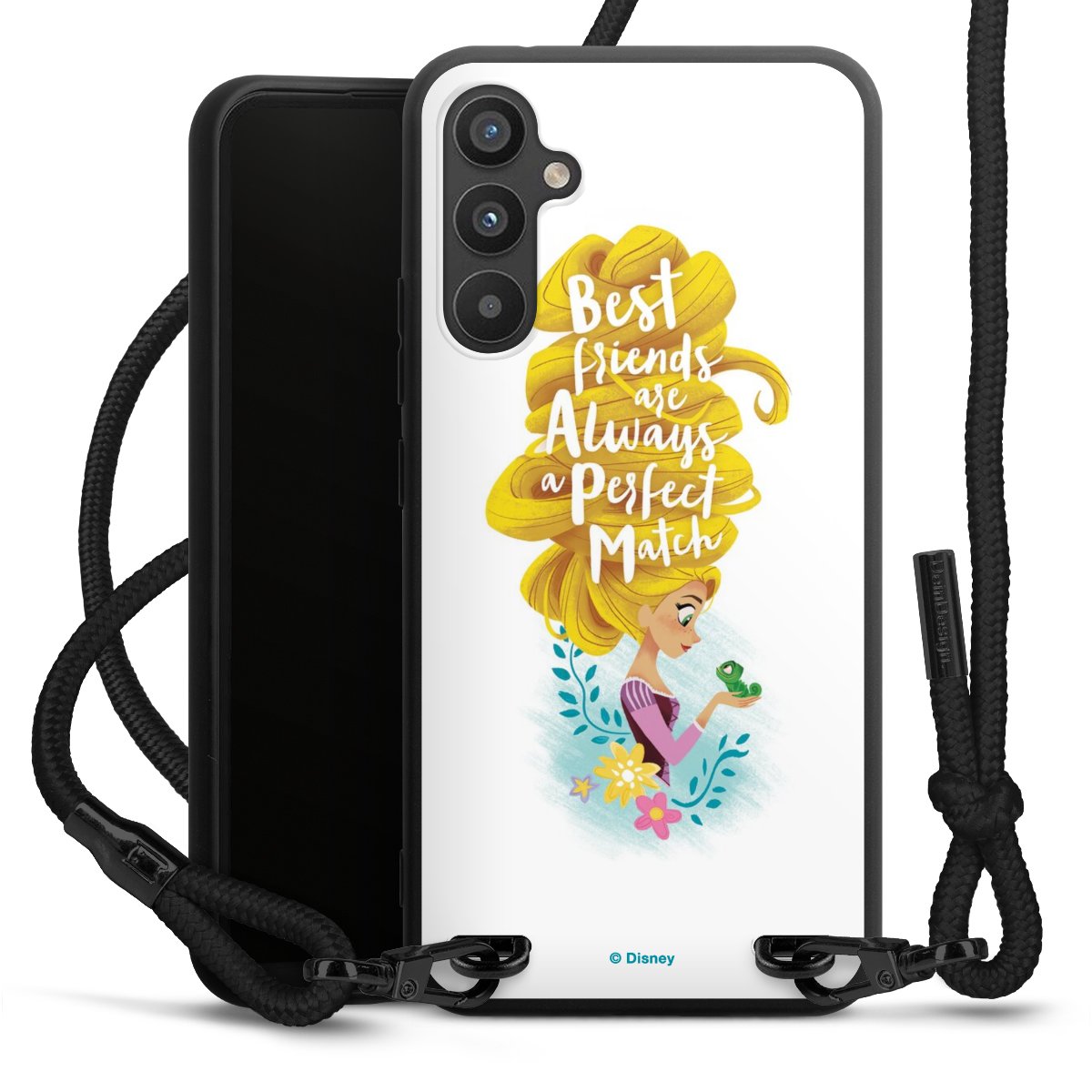 The matt black silicone case is made of flexible TPU (thermoplastic polyurethane) and offers robust protection. The durable, unbreakable material makes the cover flexible and dimensionally stable at the same time. The matte surface makes your design stand out more and is less susceptible to fingerprints and dirt. The stylish trend accessory fits comfortably in the hand and is perfectly complemented by the fabric (polyester) mobile phone strap. The braided fabric strap is approx. 1.70 metres long with a diameter of approx. 0.5 cm. Due to the special knotting technique, the length of the strap can be adjusted by simply pulling it, so that you can adapt it individually to your wishes. The practical case to wear around your neck is available with the fabric strap in black. As a little icing on the cake, we have provided the strap with a chic metal fastener in matt black. The strap is securely fastened to the case with loops made of high-quality genuine leather and press studs. The ends of the fabric strap are covered with metallic end caps and thus protected from fraying.