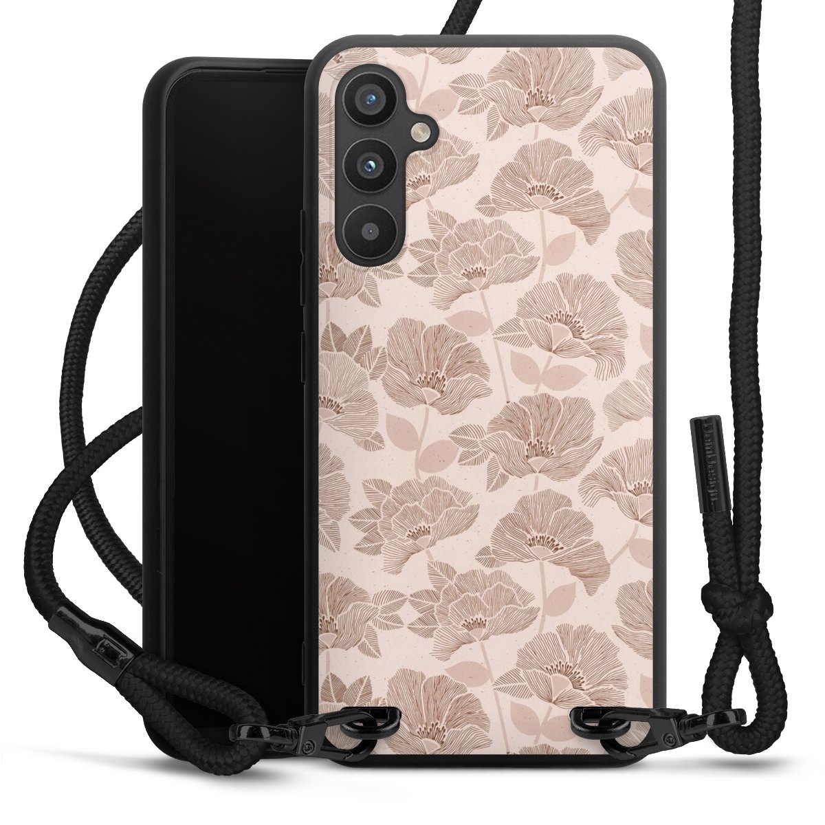 The matt black silicone case is made of flexible TPU (thermoplastic polyurethane) and offers robust protection. The durable, unbreakable material makes the cover flexible and dimensionally stable at the same time. The matte surface makes your design stand out more and is less susceptible to fingerprints and dirt. The stylish trend accessory fits comfortably in the hand and is perfectly complemented by the fabric (polyester) mobile phone strap. The braided fabric strap is approx. 1.70 metres long with a diameter of approx. 0.5 cm. Due to the special knotting technique, the length of the strap can be adjusted by simply pulling it, so that you can adapt it individually to your wishes. The practical case to wear around your neck is available with the fabric strap in black. As a little icing on the cake, we have provided the strap with a chic metal fastener in matt black. The strap is securely fastened to the case with loops made of high-quality genuine leather and press studs. The ends of the fabric strap are covered with metallic end caps and thus protected from fraying.
