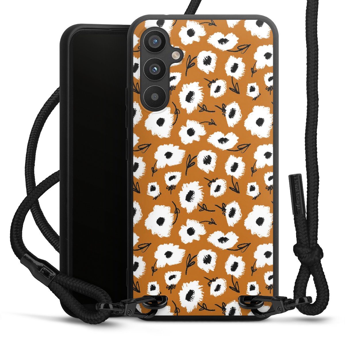 The matt black silicone case is made of flexible TPU (thermoplastic polyurethane) and offers robust protection. The durable, unbreakable material makes the cover flexible and dimensionally stable at the same time. The matte surface makes your design stand out more and is less susceptible to fingerprints and dirt. The stylish trend accessory fits comfortably in the hand and is perfectly complemented by the fabric (polyester) mobile phone strap. The braided fabric strap is approx. 1.70 metres long with a diameter of approx. 0.5 cm. Due to the special knotting technique, the length of the strap can be adjusted by simply pulling it, so that you can adapt it individually to your wishes. The practical case to wear around your neck is available with the fabric strap in black. As a little icing on the cake, we have provided the strap with a chic metal fastener in matt black. The strap is securely fastened to the case with loops made of high-quality genuine leather and press studs. The ends of the fabric strap are covered with metallic end caps and thus protected from fraying.