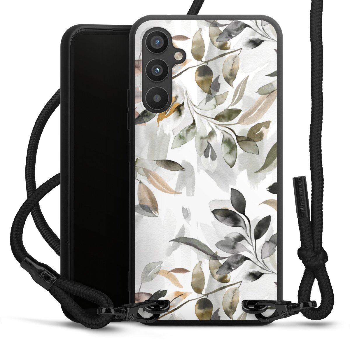 The matt black silicone case is made of flexible TPU (thermoplastic polyurethane) and offers robust protection. The durable, unbreakable material makes the cover flexible and dimensionally stable at the same time. The matte surface makes your design stand out more and is less susceptible to fingerprints and dirt. The stylish trend accessory fits comfortably in the hand and is perfectly complemented by the fabric (polyester) mobile phone strap. The braided fabric strap is approx. 1.70 metres long with a diameter of approx. 0.5 cm. Due to the special knotting technique, the length of the strap can be adjusted by simply pulling it, so that you can adapt it individually to your wishes. The practical case to wear around your neck is available with the fabric strap in black. As a little icing on the cake, we have provided the strap with a chic metal fastener in matt black. The strap is securely fastened to the case with loops made of high-quality genuine leather and press studs. The ends of the fabric strap are covered with metallic end caps and thus protected from fraying.