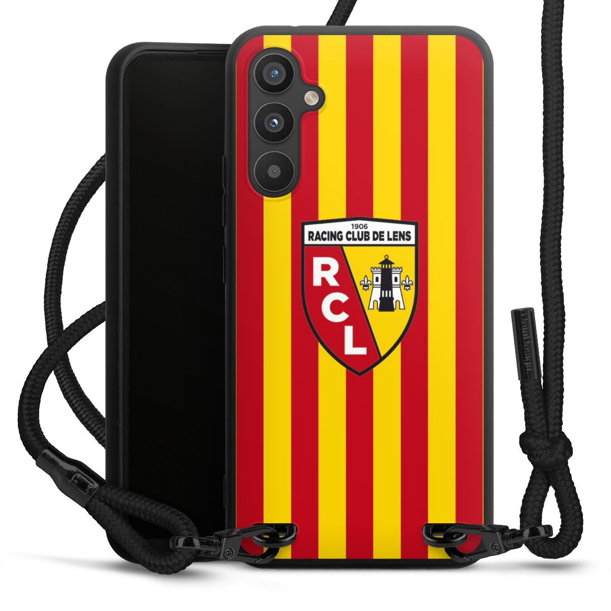 The matt black silicone case is made of flexible TPU (thermoplastic polyurethane) and offers robust protection. The durable, unbreakable material makes the cover flexible and dimensionally stable at the same time. The matte surface makes your design stand out more and is less susceptible to fingerprints and dirt. The stylish trend accessory fits comfortably in the hand and is perfectly complemented by the fabric (polyester) mobile phone strap. The braided fabric strap is approx. 1.70 metres long with a diameter of approx. 0.5 cm. Due to the special knotting technique, the length of the strap can be adjusted by simply pulling it, so that you can adapt it individually to your wishes. The practical case to wear around your neck is available with the fabric strap in black. As a little icing on the cake, we have provided the strap with a chic metal fastener in matt black. The strap is securely fastened to the case with loops made of high-quality genuine leather and press studs. The ends of the fabric strap are covered with metallic end caps and thus protected from fraying.