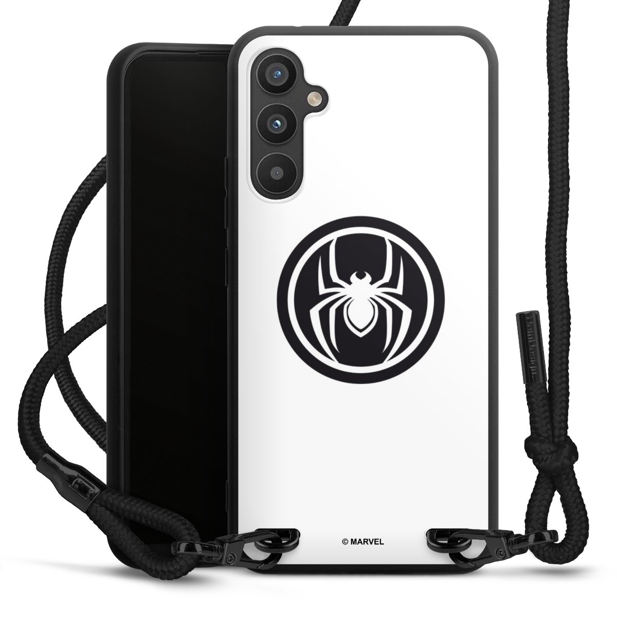 The matt black silicone case is made of flexible TPU (thermoplastic polyurethane) and offers robust protection. The durable, unbreakable material makes the cover flexible and dimensionally stable at the same time. The matte surface makes your design stand out more and is less susceptible to fingerprints and dirt. The stylish trend accessory fits comfortably in the hand and is perfectly complemented by the fabric (polyester) mobile phone strap. The braided fabric strap is approx. 1.70 metres long with a diameter of approx. 0.5 cm. Due to the special knotting technique, the length of the strap can be adjusted by simply pulling it, so that you can adapt it individually to your wishes. The practical case to wear around your neck is available with the fabric strap in black. As a little icing on the cake, we have provided the strap with a chic metal fastener in matt black. The strap is securely fastened to the case with loops made of high-quality genuine leather and press studs. The ends of the fabric strap are covered with metallic end caps and thus protected from fraying.