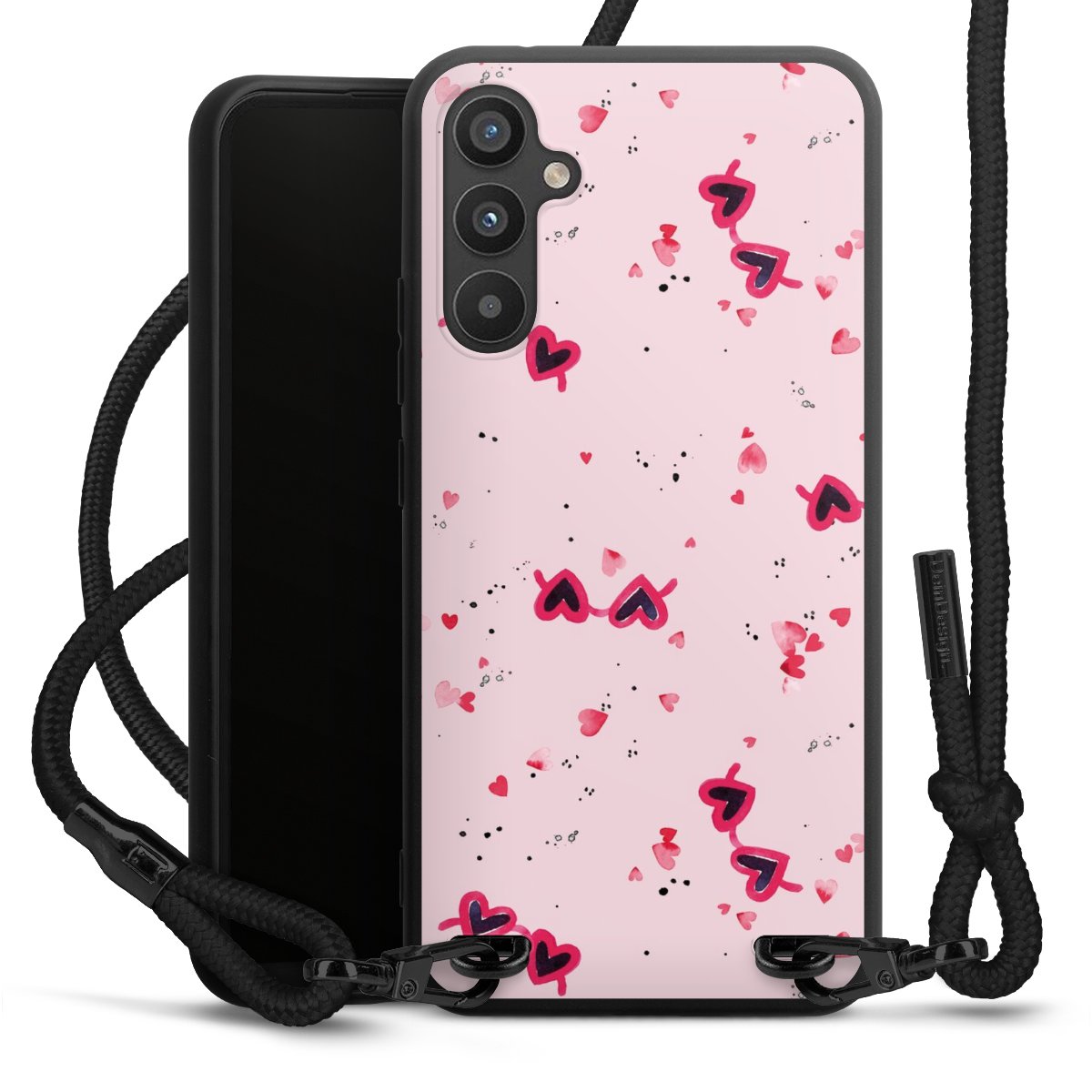 The matt black silicone case is made of flexible TPU (thermoplastic polyurethane) and offers robust protection. The durable, unbreakable material makes the cover flexible and dimensionally stable at the same time. The matte surface makes your design stand out more and is less susceptible to fingerprints and dirt. The stylish trend accessory fits comfortably in the hand and is perfectly complemented by the fabric (polyester) mobile phone strap. The braided fabric strap is approx. 1.70 metres long with a diameter of approx. 0.5 cm. Due to the special knotting technique, the length of the strap can be adjusted by simply pulling it, so that you can adapt it individually to your wishes. The practical case to wear around your neck is available with the fabric strap in black. As a little icing on the cake, we have provided the strap with a chic metal fastener in matt black. The strap is securely fastened to the case with loops made of high-quality genuine leather and press studs. The ends of the fabric strap are covered with metallic end caps and thus protected from fraying.