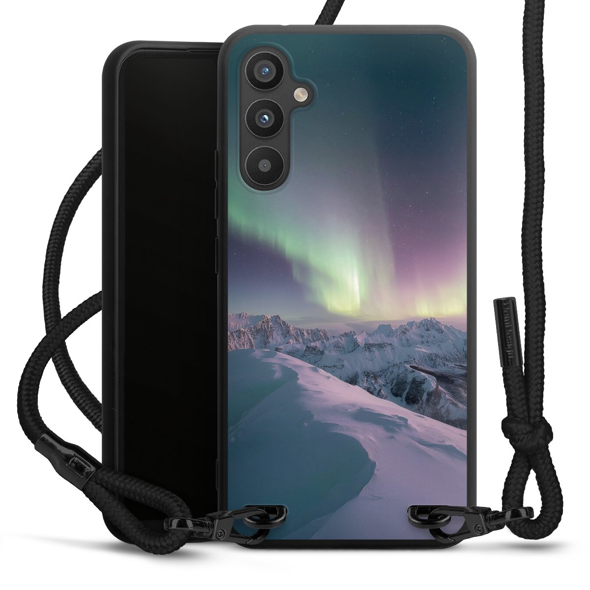 The matt black silicone case is made of flexible TPU (thermoplastic polyurethane) and offers robust protection. The durable, unbreakable material makes the cover flexible and dimensionally stable at the same time. The matte surface makes your design stand out more and is less susceptible to fingerprints and dirt. The stylish trend accessory fits comfortably in the hand and is perfectly complemented by the fabric (polyester) mobile phone strap. The braided fabric strap is approx. 1.70 metres long with a diameter of approx. 0.5 cm. Due to the special knotting technique, the length of the strap can be adjusted by simply pulling it, so that you can adapt it individually to your wishes. The practical case to wear around your neck is available with the fabric strap in black. As a little icing on the cake, we have provided the strap with a chic metal fastener in matt black. The strap is securely fastened to the case with loops made of high-quality genuine leather and press studs. The ends of the fabric strap are covered with metallic end caps and thus protected from fraying.