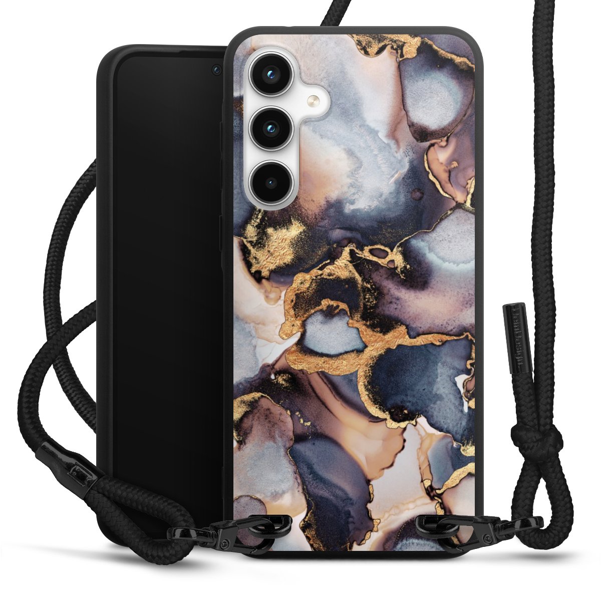 The matt black silicone case is made of flexible TPU (thermoplastic polyurethane) and offers robust protection. The durable, unbreakable material makes the cover flexible and dimensionally stable at the same time. The matte surface makes your design stand out more and is less susceptible to fingerprints and dirt. The stylish trend accessory fits comfortably in the hand and is perfectly complemented by the fabric (polyester) mobile phone strap. The braided fabric strap is approx. 1.70 metres long with a diameter of approx. 0.5 cm. Due to the special knotting technique, the length of the strap can be adjusted by simply pulling it, so that you can adapt it individually to your wishes. The practical case to wear around your neck is available with the fabric strap in black. As a little icing on the cake, we have provided the strap with a chic metal fastener in matt black. The strap is securely fastened to the case with loops made of high-quality genuine leather and press studs. The ends of the fabric strap are covered with metallic end caps and thus protected from fraying.