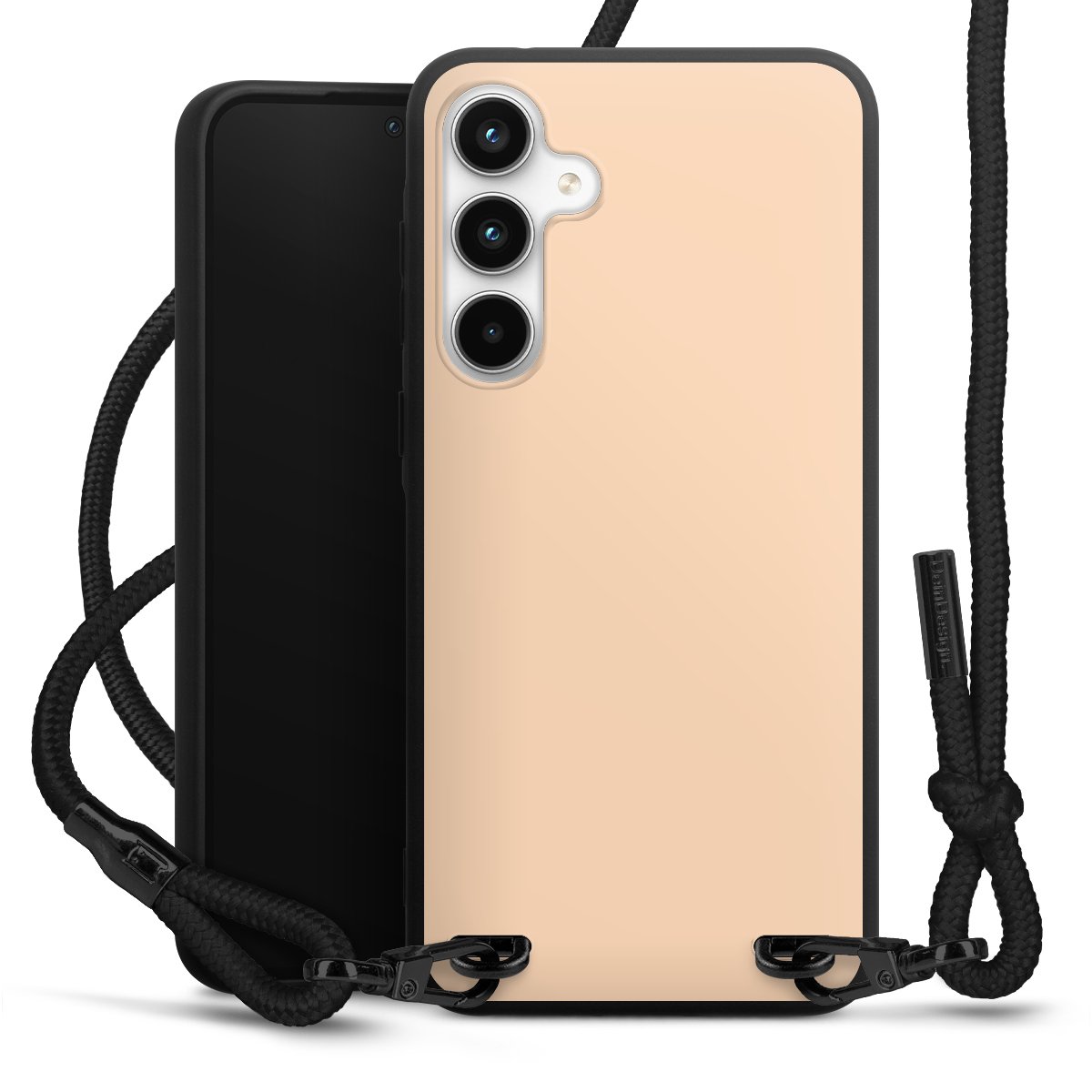 The matt black silicone case is made of flexible TPU (thermoplastic polyurethane) and offers robust protection. The durable, unbreakable material makes the cover flexible and dimensionally stable at the same time. The matte surface makes your design stand out more and is less susceptible to fingerprints and dirt. The stylish trend accessory fits comfortably in the hand and is perfectly complemented by the fabric (polyester) mobile phone strap. The braided fabric strap is approx. 1.70 metres long with a diameter of approx. 0.5 cm. Due to the special knotting technique, the length of the strap can be adjusted by simply pulling it, so that you can adapt it individually to your wishes. The practical case to wear around your neck is available with the fabric strap in black. As a little icing on the cake, we have provided the strap with a chic metal fastener in matt black. The strap is securely fastened to the case with loops made of high-quality genuine leather and press studs. The ends of the fabric strap are covered with metallic end caps and thus protected from fraying.