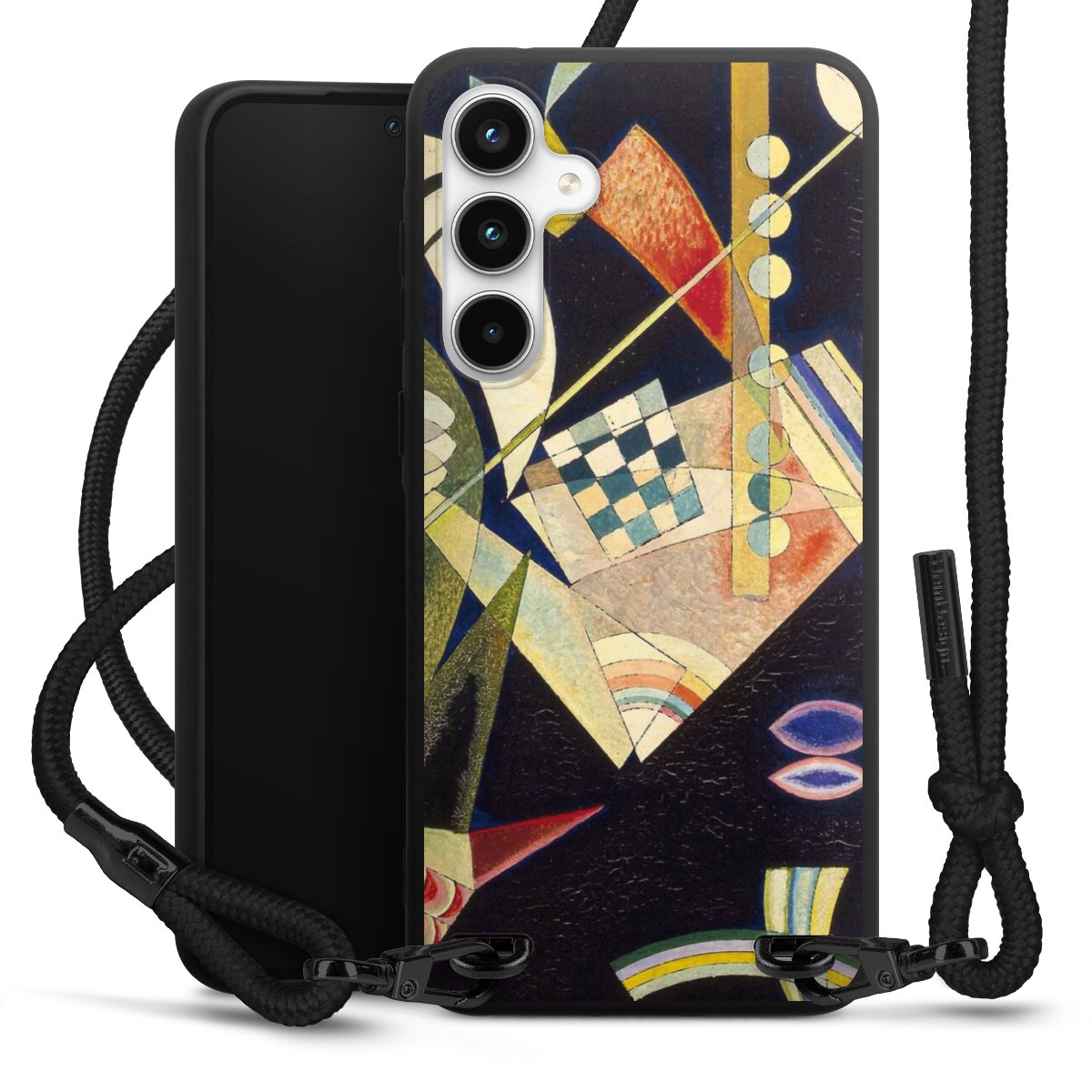 The matt black silicone case is made of flexible TPU (thermoplastic polyurethane) and offers robust protection. The durable, unbreakable material makes the cover flexible and dimensionally stable at the same time. The matte surface makes your design stand out more and is less susceptible to fingerprints and dirt. The stylish trend accessory fits comfortably in the hand and is perfectly complemented by the fabric (polyester) mobile phone strap. The braided fabric strap is approx. 1.70 metres long with a diameter of approx. 0.5 cm. Due to the special knotting technique, the length of the strap can be adjusted by simply pulling it, so that you can adapt it individually to your wishes. The practical case to wear around your neck is available with the fabric strap in black. As a little icing on the cake, we have provided the strap with a chic metal fastener in matt black. The strap is securely fastened to the case with loops made of high-quality genuine leather and press studs. The ends of the fabric strap are covered with metallic end caps and thus protected from fraying.