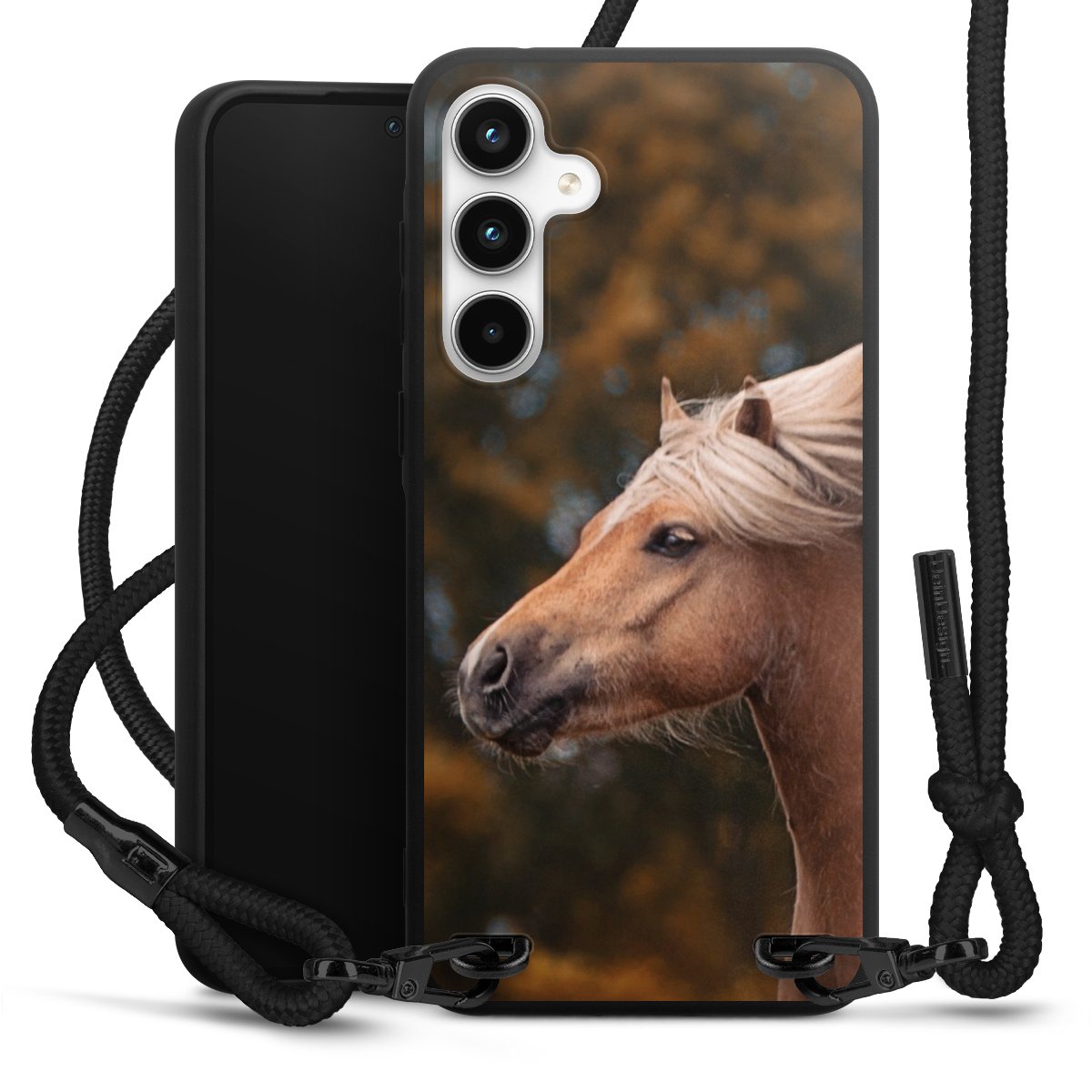 The matt black silicone case is made of flexible TPU (thermoplastic polyurethane) and offers robust protection. The durable, unbreakable material makes the cover flexible and dimensionally stable at the same time. The matte surface makes your design stand out more and is less susceptible to fingerprints and dirt. The stylish trend accessory fits comfortably in the hand and is perfectly complemented by the fabric (polyester) mobile phone strap. The braided fabric strap is approx. 1.70 metres long with a diameter of approx. 0.5 cm. Due to the special knotting technique, the length of the strap can be adjusted by simply pulling it, so that you can adapt it individually to your wishes. The practical case to wear around your neck is available with the fabric strap in black. As a little icing on the cake, we have provided the strap with a chic metal fastener in matt black. The strap is securely fastened to the case with loops made of high-quality genuine leather and press studs. The ends of the fabric strap are covered with metallic end caps and thus protected from fraying.