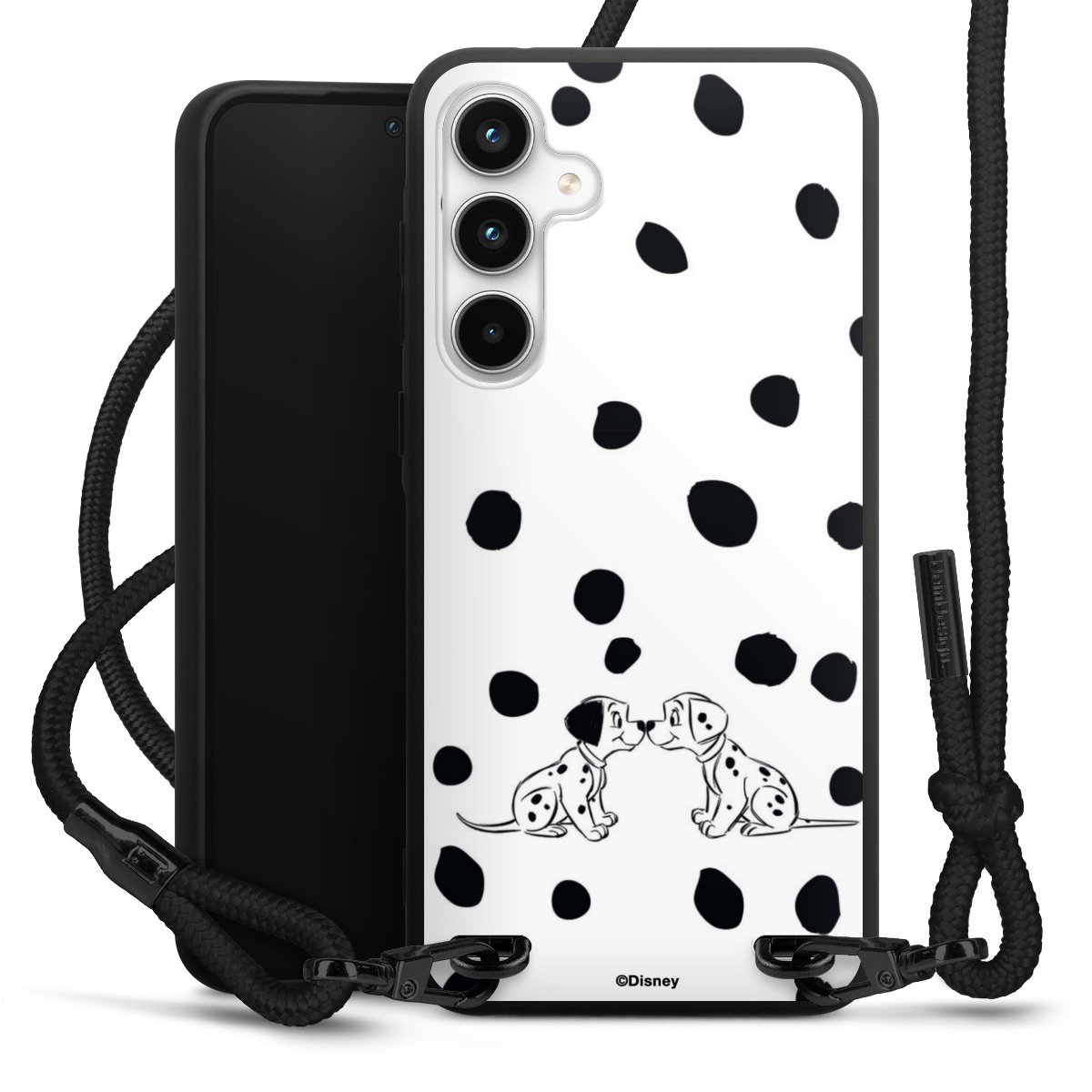 The matt black silicone case is made of flexible TPU (thermoplastic polyurethane) and offers robust protection. The durable, unbreakable material makes the cover flexible and dimensionally stable at the same time. The matte surface makes your design stand out more and is less susceptible to fingerprints and dirt. The stylish trend accessory fits comfortably in the hand and is perfectly complemented by the fabric (polyester) mobile phone strap. The braided fabric strap is approx. 1.70 metres long with a diameter of approx. 0.5 cm. Due to the special knotting technique, the length of the strap can be adjusted by simply pulling it, so that you can adapt it individually to your wishes. The practical case to wear around your neck is available with the fabric strap in black. As a little icing on the cake, we have provided the strap with a chic metal fastener in matt black. The strap is securely fastened to the case with loops made of high-quality genuine leather and press studs. The ends of the fabric strap are covered with metallic end caps and thus protected from fraying.