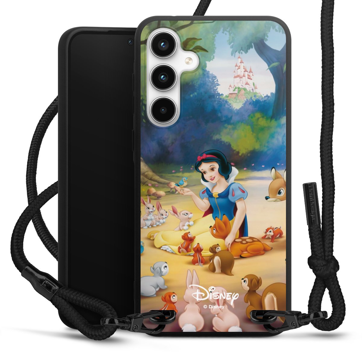 The matt black silicone case is made of flexible TPU (thermoplastic polyurethane) and offers robust protection. The durable, unbreakable material makes the cover flexible and dimensionally stable at the same time. The matte surface makes your design stand out more and is less susceptible to fingerprints and dirt. The stylish trend accessory fits comfortably in the hand and is perfectly complemented by the fabric (polyester) mobile phone strap. The braided fabric strap is approx. 1.70 metres long with a diameter of approx. 0.5 cm. Due to the special knotting technique, the length of the strap can be adjusted by simply pulling it, so that you can adapt it individually to your wishes. The practical case to wear around your neck is available with the fabric strap in black. As a little icing on the cake, we have provided the strap with a chic metal fastener in matt black. The strap is securely fastened to the case with loops made of high-quality genuine leather and press studs. The ends of the fabric strap are covered with metallic end caps and thus protected from fraying.