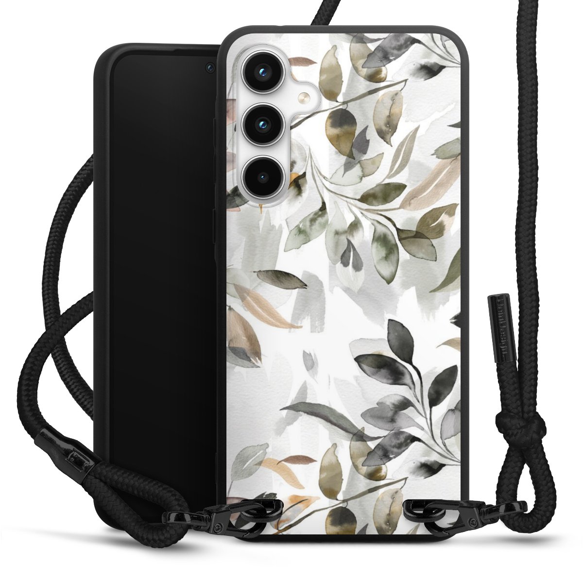 The matt black silicone case is made of flexible TPU (thermoplastic polyurethane) and offers robust protection. The durable, unbreakable material makes the cover flexible and dimensionally stable at the same time. The matte surface makes your design stand out more and is less susceptible to fingerprints and dirt. The stylish trend accessory fits comfortably in the hand and is perfectly complemented by the fabric (polyester) mobile phone strap. The braided fabric strap is approx. 1.70 metres long with a diameter of approx. 0.5 cm. Due to the special knotting technique, the length of the strap can be adjusted by simply pulling it, so that you can adapt it individually to your wishes. The practical case to wear around your neck is available with the fabric strap in black. As a little icing on the cake, we have provided the strap with a chic metal fastener in matt black. The strap is securely fastened to the case with loops made of high-quality genuine leather and press studs. The ends of the fabric strap are covered with metallic end caps and thus protected from fraying.