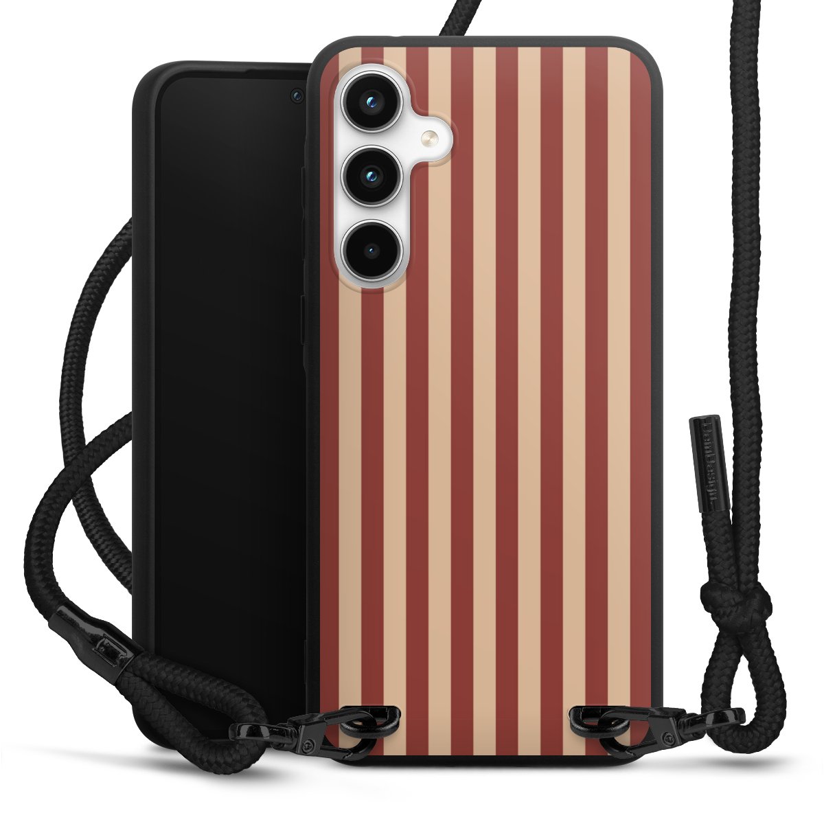 The matt black silicone case is made of flexible TPU (thermoplastic polyurethane) and offers robust protection. The durable, unbreakable material makes the cover flexible and dimensionally stable at the same time. The matte surface makes your design stand out more and is less susceptible to fingerprints and dirt. The stylish trend accessory fits comfortably in the hand and is perfectly complemented by the fabric (polyester) mobile phone strap. The braided fabric strap is approx. 1.70 metres long with a diameter of approx. 0.5 cm. Due to the special knotting technique, the length of the strap can be adjusted by simply pulling it, so that you can adapt it individually to your wishes. The practical case to wear around your neck is available with the fabric strap in black. As a little icing on the cake, we have provided the strap with a chic metal fastener in matt black. The strap is securely fastened to the case with loops made of high-quality genuine leather and press studs. The ends of the fabric strap are covered with metallic end caps and thus protected from fraying.