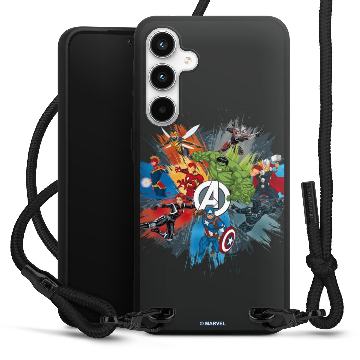 The matt black silicone case is made of flexible TPU (thermoplastic polyurethane) and offers robust protection. The durable, unbreakable material makes the cover flexible and dimensionally stable at the same time. The matte surface makes your design stand out more and is less susceptible to fingerprints and dirt. The stylish trend accessory fits comfortably in the hand and is perfectly complemented by the fabric (polyester) mobile phone strap. The braided fabric strap is approx. 1.70 metres long with a diameter of approx. 0.5 cm. Due to the special knotting technique, the length of the strap can be adjusted by simply pulling it, so that you can adapt it individually to your wishes. The practical case to wear around your neck is available with the fabric strap in black. As a little icing on the cake, we have provided the strap with a chic metal fastener in matt black. The strap is securely fastened to the case with loops made of high-quality genuine leather and press studs. The ends of the fabric strap are covered with metallic end caps and thus protected from fraying.