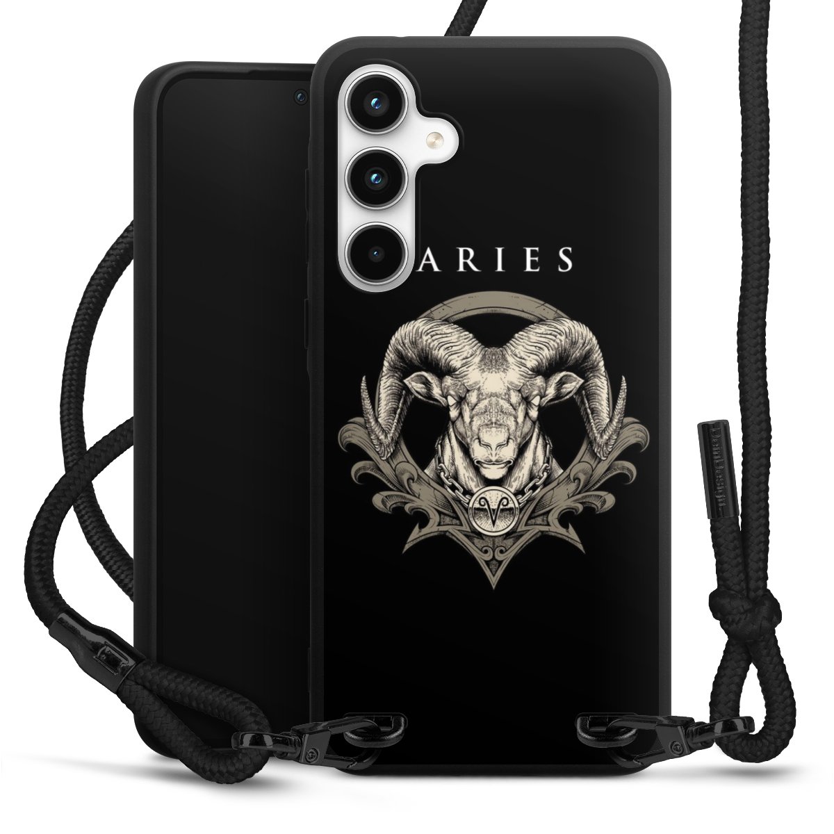 The matt black silicone case is made of flexible TPU (thermoplastic polyurethane) and offers robust protection. The durable, unbreakable material makes the cover flexible and dimensionally stable at the same time. The matte surface makes your design stand out more and is less susceptible to fingerprints and dirt. The stylish trend accessory fits comfortably in the hand and is perfectly complemented by the fabric (polyester) mobile phone strap. The braided fabric strap is approx. 1.70 metres long with a diameter of approx. 0.5 cm. Due to the special knotting technique, the length of the strap can be adjusted by simply pulling it, so that you can adapt it individually to your wishes. The practical case to wear around your neck is available with the fabric strap in black. As a little icing on the cake, we have provided the strap with a chic metal fastener in matt black. The strap is securely fastened to the case with loops made of high-quality genuine leather and press studs. The ends of the fabric strap are covered with metallic end caps and thus protected from fraying.
