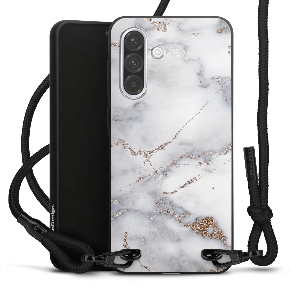 The matt black silicone case is made of flexible TPU (thermoplastic polyurethane) and offers robust protection. The durable, unbreakable material makes the cover flexible and dimensionally stable at the same time. The matte surface makes your design stand out more and is less susceptible to fingerprints and dirt. The stylish trend accessory fits comfortably in the hand and is perfectly complemented by the fabric (polyester) mobile phone strap. The braided fabric strap is approx. 1.70 metres long with a diameter of approx. 0.5 cm. Due to the special knotting technique, the length of the strap can be adjusted by simply pulling it, so that you can adapt it individually to your wishes. The practical case to wear around your neck is available with the fabric strap in black. As a little icing on the cake, we have provided the strap with a chic metal fastener in matt black. The strap is securely fastened to the case with loops made of high-quality genuine leather and press studs. The ends of the fabric strap are covered with metallic end caps and thus protected from fraying.
