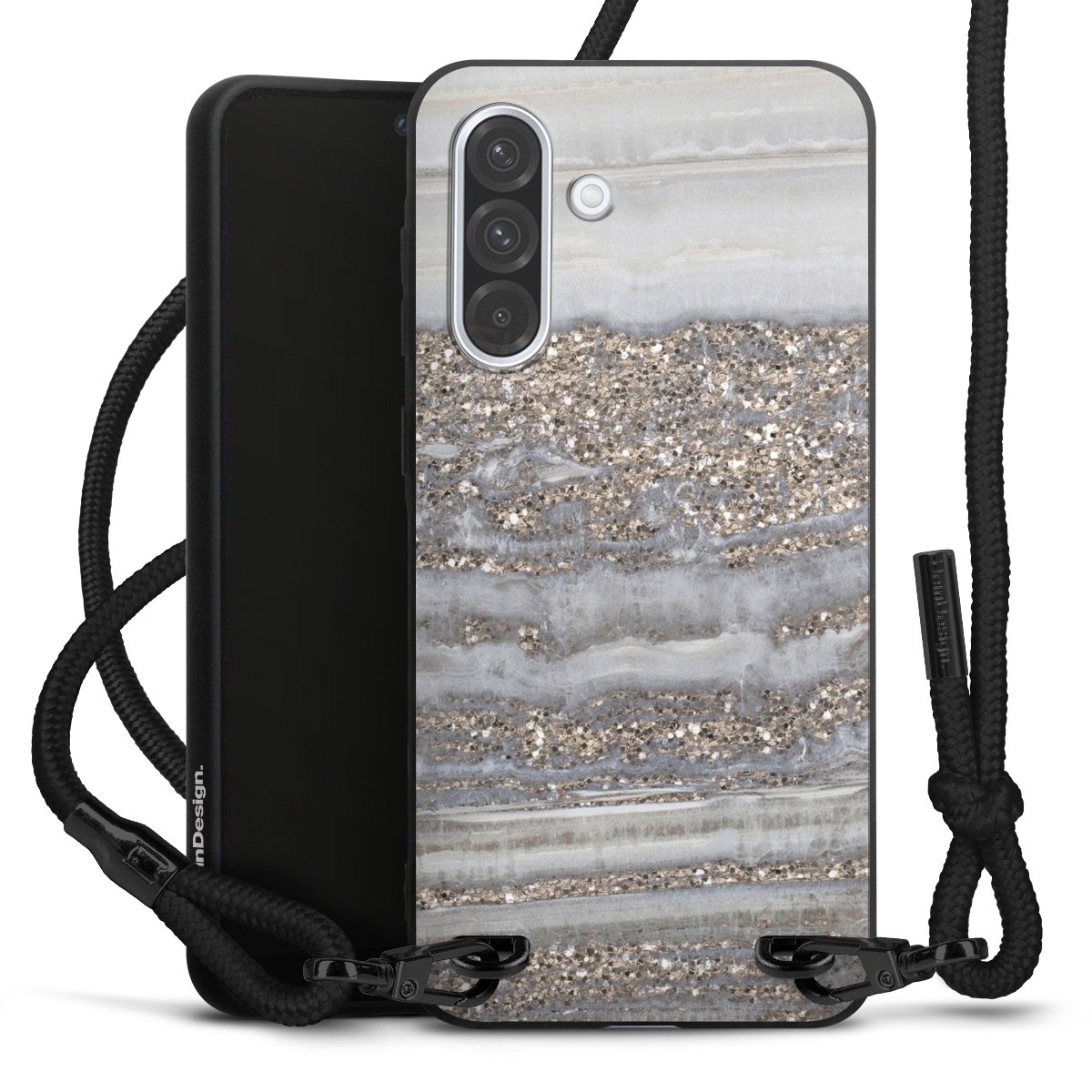 Pure Black: Phone case, fabric strap and metal details in stylish matt black.