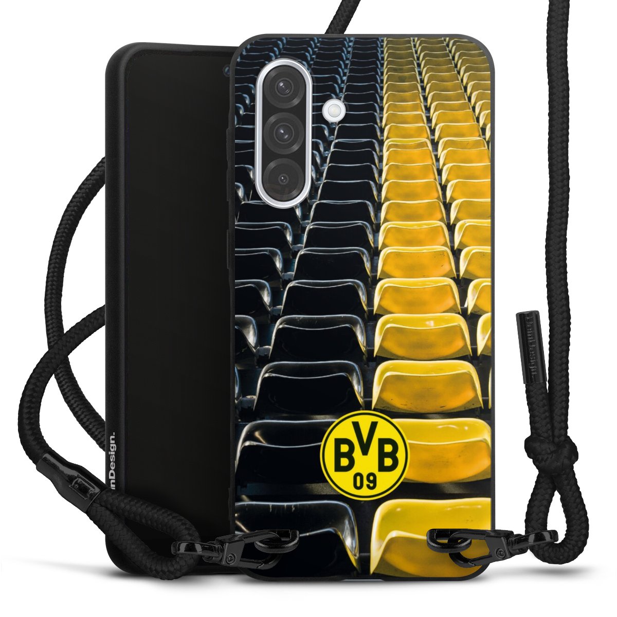 The matt black silicone case is made of flexible TPU (thermoplastic polyurethane) and offers robust protection. The durable, unbreakable material makes the cover flexible and dimensionally stable at the same time. The matte surface makes your design stand out more and is less susceptible to fingerprints and dirt. The stylish trend accessory fits comfortably in the hand and is perfectly complemented by the fabric (polyester) mobile phone strap. The braided fabric strap is approx. 1.70 metres long with a diameter of approx. 0.5 cm. Due to the special knotting technique, the length of the strap can be adjusted by simply pulling it, so that you can adapt it individually to your wishes. The practical case to wear around your neck is available with the fabric strap in black. As a little icing on the cake, we have provided the strap with a chic metal fastener in matt black. The strap is securely fastened to the case with loops made of high-quality genuine leather and press studs. The ends of the fabric strap are covered with metallic end caps and thus protected from fraying.