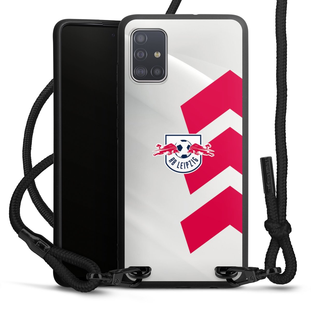 The matt black silicone case is made of flexible TPU (thermoplastic polyurethane) and offers robust protection. The durable, unbreakable material makes the cover flexible and dimensionally stable at the same time. The matte surface makes your design stand out more and is less susceptible to fingerprints and dirt. The stylish trend accessory fits comfortably in the hand and is perfectly complemented by the fabric (polyester) mobile phone strap. The braided fabric strap is approx. 1.70 metres long with a diameter of approx. 0.5 cm. Due to the special knotting technique, the length of the strap can be adjusted by simply pulling it, so that you can adapt it individually to your wishes. The practical case to wear around your neck is available with the fabric strap in black. As a little icing on the cake, we have provided the strap with a chic metal fastener in matt black. The strap is securely fastened to the case with loops made of high-quality genuine leather and press studs. The ends of the fabric strap are covered with metallic end caps and thus protected from fraying.