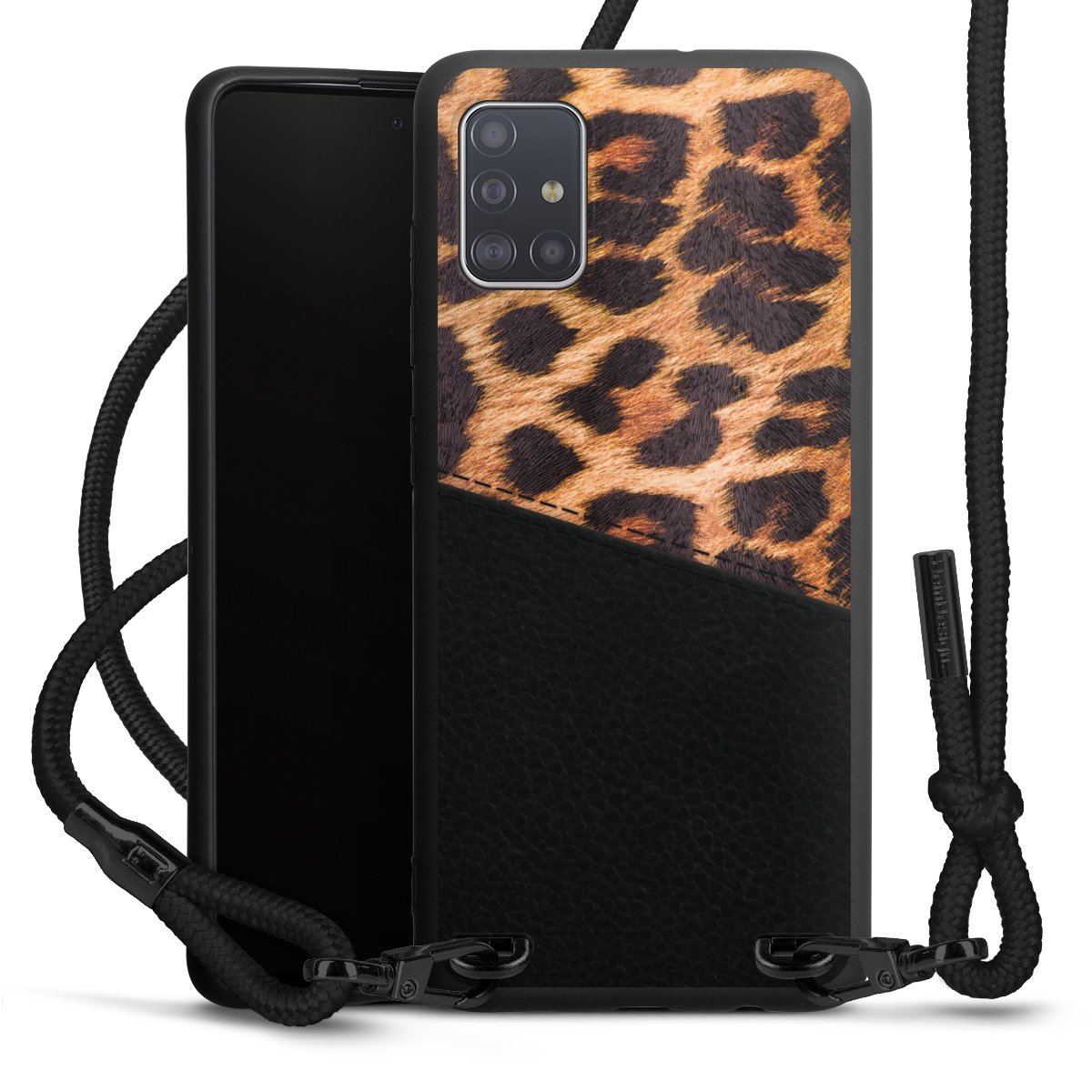 The matt black silicone case is made of flexible TPU (thermoplastic polyurethane) and offers robust protection. The durable, unbreakable material makes the cover flexible and dimensionally stable at the same time. The matte surface makes your design stand out more and is less susceptible to fingerprints and dirt. The stylish trend accessory fits comfortably in the hand and is perfectly complemented by the fabric (polyester) mobile phone strap. The braided fabric strap is approx. 1.70 metres long with a diameter of approx. 0.5 cm. Due to the special knotting technique, the length of the strap can be adjusted by simply pulling it, so that you can adapt it individually to your wishes. The practical case to wear around your neck is available with the fabric strap in black. As a little icing on the cake, we have provided the strap with a chic metal fastener in matt black. The strap is securely fastened to the case with loops made of high-quality genuine leather and press studs. The ends of the fabric strap are covered with metallic end caps and thus protected from fraying.