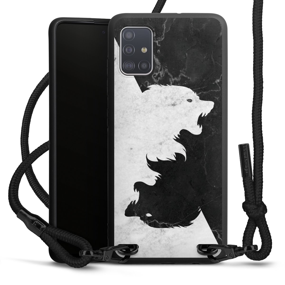 The matt black silicone case is made of flexible TPU (thermoplastic polyurethane) and offers robust protection. The durable, unbreakable material makes the cover flexible and dimensionally stable at the same time. The matte surface makes your design stand out more and is less susceptible to fingerprints and dirt. The stylish trend accessory fits comfortably in the hand and is perfectly complemented by the fabric (polyester) mobile phone strap. The braided fabric strap is approx. 1.70 metres long with a diameter of approx. 0.5 cm. Due to the special knotting technique, the length of the strap can be adjusted by simply pulling it, so that you can adapt it individually to your wishes. The practical case to wear around your neck is available with the fabric strap in black. As a little icing on the cake, we have provided the strap with a chic metal fastener in matt black. The strap is securely fastened to the case with loops made of high-quality genuine leather and press studs. The ends of the fabric strap are covered with metallic end caps and thus protected from fraying.
