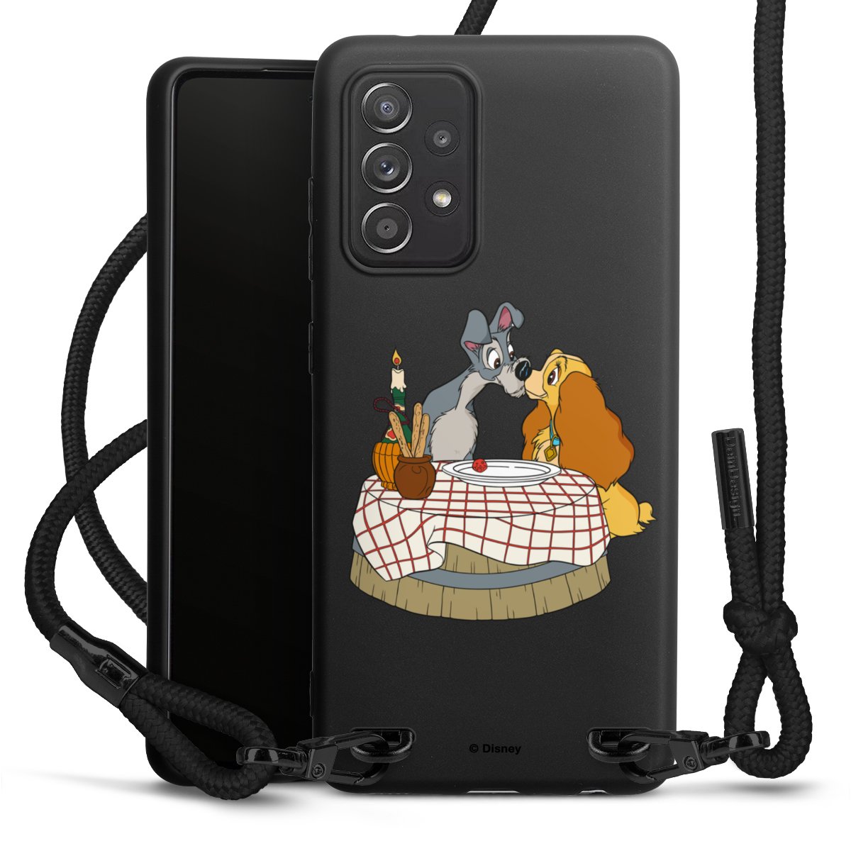 The matt black silicone case is made of flexible TPU (thermoplastic polyurethane) and offers robust protection. The durable, unbreakable material makes the cover flexible and dimensionally stable at the same time. The matte surface makes your design stand out more and is less susceptible to fingerprints and dirt. The stylish trend accessory fits comfortably in the hand and is perfectly complemented by the fabric (polyester) mobile phone strap. The braided fabric strap is approx. 1.70 metres long with a diameter of approx. 0.5 cm. Due to the special knotting technique, the length of the strap can be adjusted by simply pulling it, so that you can adapt it individually to your wishes. The practical case to wear around your neck is available with the fabric strap in black. As a little icing on the cake, we have provided the strap with a chic metal fastener in matt black. The strap is securely fastened to the case with loops made of high-quality genuine leather and press studs. The ends of the fabric strap are covered with metallic end caps and thus protected from fraying.
