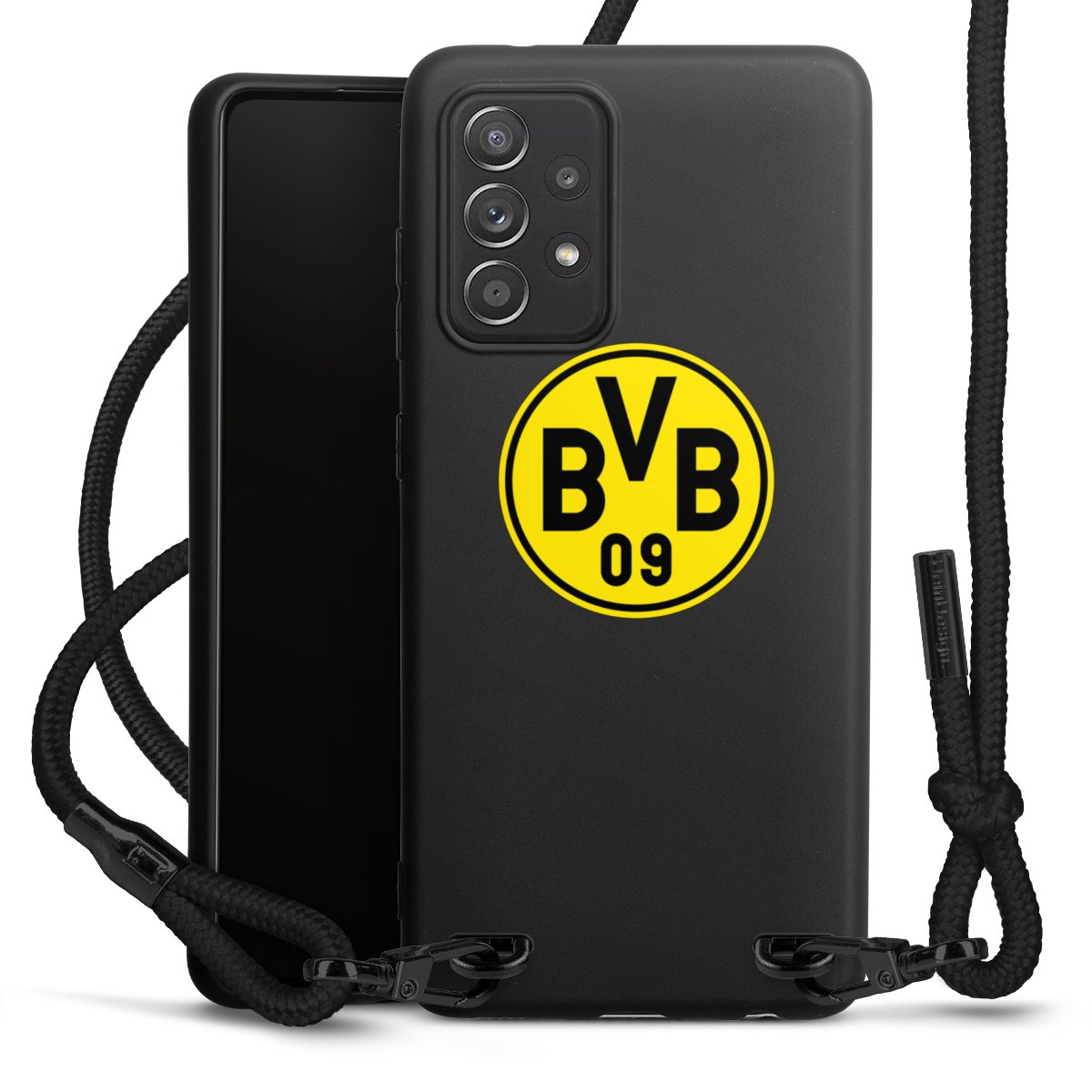 The matt black silicone case is made of flexible TPU (thermoplastic polyurethane) and offers robust protection. The durable, unbreakable material makes the cover flexible and dimensionally stable at the same time. The matte surface makes your design stand out more and is less susceptible to fingerprints and dirt. The stylish trend accessory fits comfortably in the hand and is perfectly complemented by the fabric (polyester) mobile phone strap. The braided fabric strap is approx. 1.70 metres long with a diameter of approx. 0.5 cm. Due to the special knotting technique, the length of the strap can be adjusted by simply pulling it, so that you can adapt it individually to your wishes. The practical case to wear around your neck is available with the fabric strap in black. As a little icing on the cake, we have provided the strap with a chic metal fastener in matt black. The strap is securely fastened to the case with loops made of high-quality genuine leather and press studs. The ends of the fabric strap are covered with metallic end caps and thus protected from fraying.