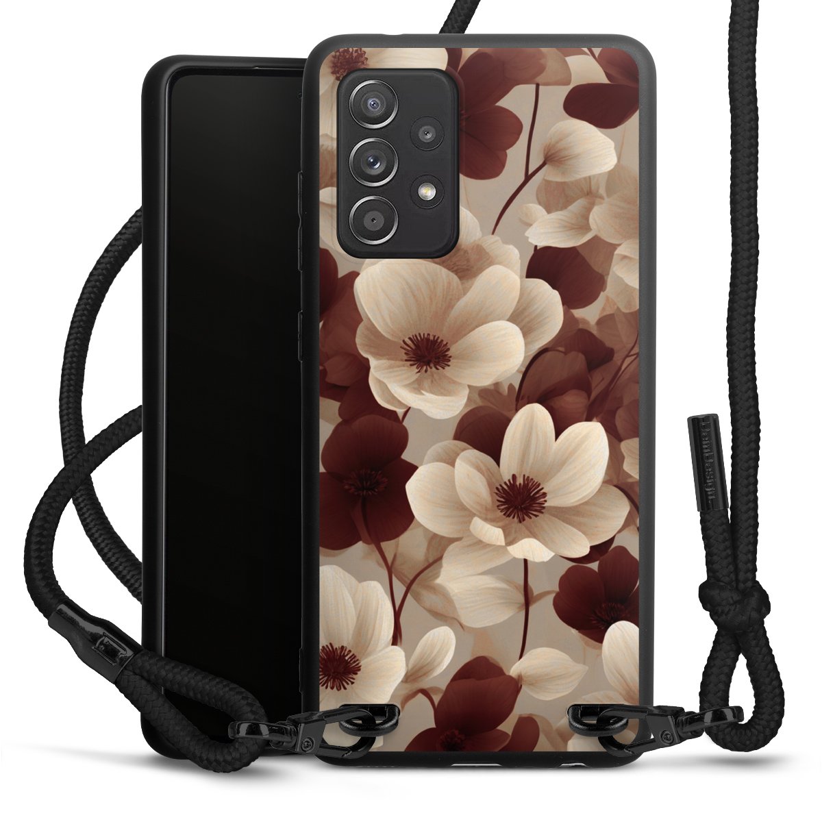 The matt black silicone case is made of flexible TPU (thermoplastic polyurethane) and offers robust protection. The durable, unbreakable material makes the cover flexible and dimensionally stable at the same time. The matte surface makes your design stand out more and is less susceptible to fingerprints and dirt. The stylish trend accessory fits comfortably in the hand and is perfectly complemented by the fabric (polyester) mobile phone strap. The braided fabric strap is approx. 1.70 metres long with a diameter of approx. 0.5 cm. Due to the special knotting technique, the length of the strap can be adjusted by simply pulling it, so that you can adapt it individually to your wishes. The practical case to wear around your neck is available with the fabric strap in black. As a little icing on the cake, we have provided the strap with a chic metal fastener in matt black. The strap is securely fastened to the case with loops made of high-quality genuine leather and press studs. The ends of the fabric strap are covered with metallic end caps and thus protected from fraying.
