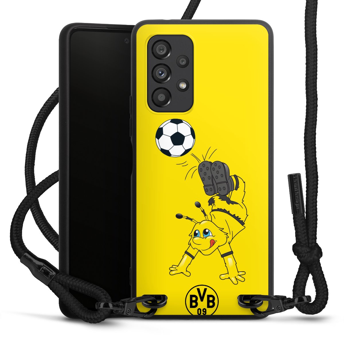 The matt black silicone case is made of flexible TPU (thermoplastic polyurethane) and offers robust protection. The durable, unbreakable material makes the cover flexible and dimensionally stable at the same time. The matte surface makes your design stand out more and is less susceptible to fingerprints and dirt. The stylish trend accessory fits comfortably in the hand and is perfectly complemented by the fabric (polyester) mobile phone strap. The braided fabric strap is approx. 1.70 metres long with a diameter of approx. 0.5 cm. Due to the special knotting technique, the length of the strap can be adjusted by simply pulling it, so that you can adapt it individually to your wishes. The practical case to wear around your neck is available with the fabric strap in black. As a little icing on the cake, we have provided the strap with a chic metal fastener in matt black. The strap is securely fastened to the case with loops made of high-quality genuine leather and press studs. The ends of the fabric strap are covered with metallic end caps and thus protected from fraying.
