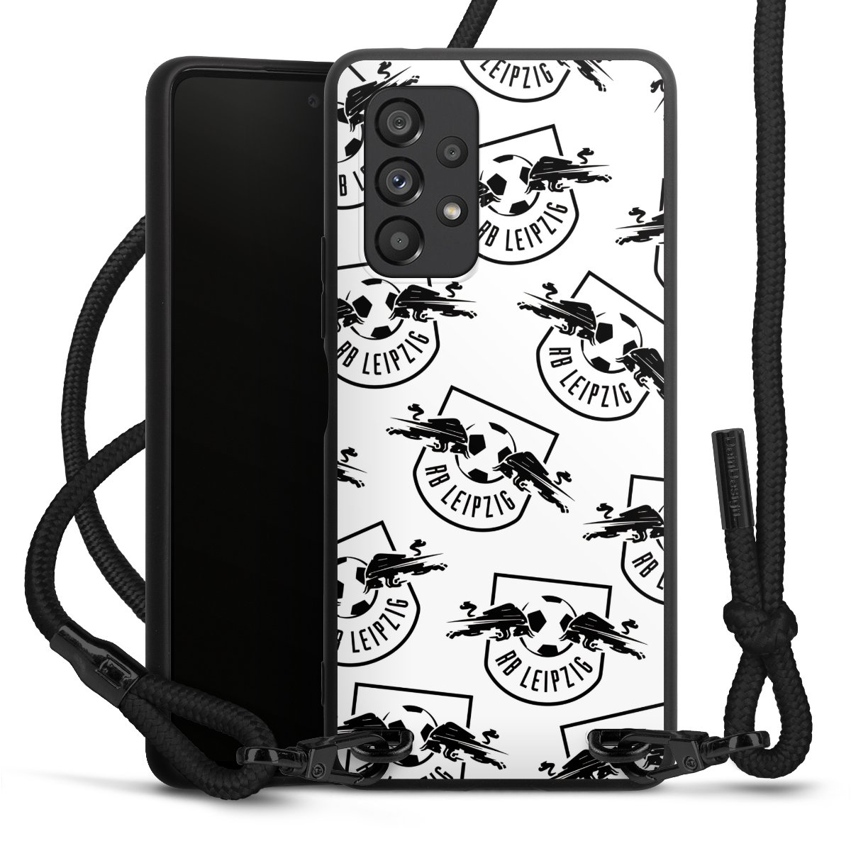 The matt black silicone case is made of flexible TPU (thermoplastic polyurethane) and offers robust protection. The durable, unbreakable material makes the cover flexible and dimensionally stable at the same time. The matte surface makes your design stand out more and is less susceptible to fingerprints and dirt. The stylish trend accessory fits comfortably in the hand and is perfectly complemented by the fabric (polyester) mobile phone strap. The braided fabric strap is approx. 1.70 metres long with a diameter of approx. 0.5 cm. Due to the special knotting technique, the length of the strap can be adjusted by simply pulling it, so that you can adapt it individually to your wishes. The practical case to wear around your neck is available with the fabric strap in black. As a little icing on the cake, we have provided the strap with a chic metal fastener in matt black. The strap is securely fastened to the case with loops made of high-quality genuine leather and press studs. The ends of the fabric strap are covered with metallic end caps and thus protected from fraying.